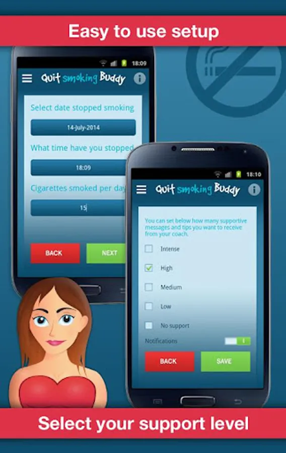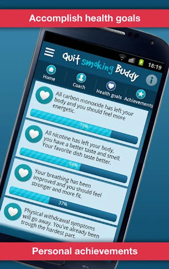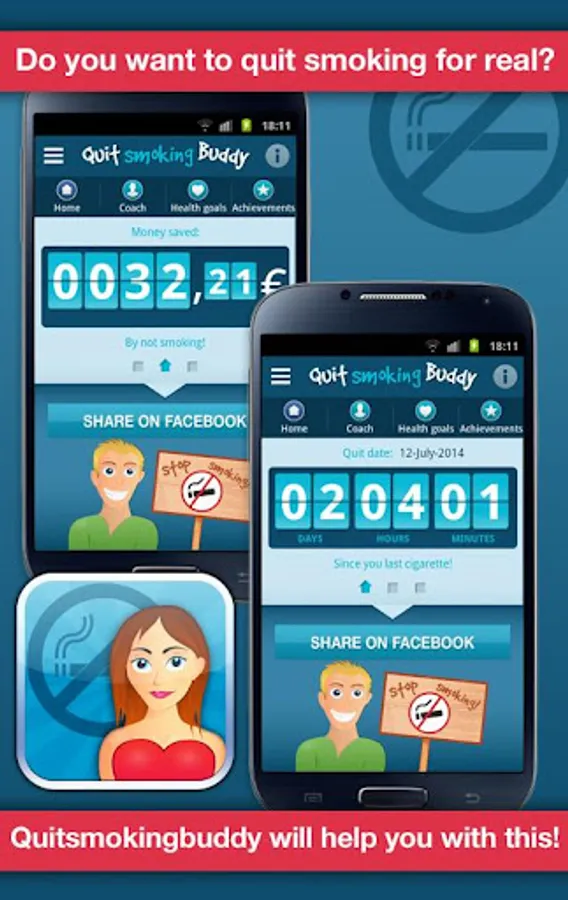 What makes the “Quit smoking buddy” app really special is your personal quit coach! Choose the level of support you need and receive daily support from your personal quit smoking coach. A life without smoking will become a realistic and reachable goal! Quit smoking today and let the Quit smoking Buddy coach help you!