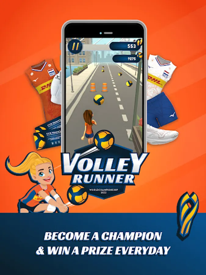 Welcome to Volley Runner. The game where you collect as many volleyballs as possible and become a volleyball champion. Customize your character and run through the streets of the official host cities of the Women's Volleyball World Cup 2022: Rotterdam, Apeldoorn and Arnhem. Everyday you can win fantastic prizes by collecting as many volleyballs as possible.