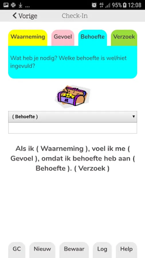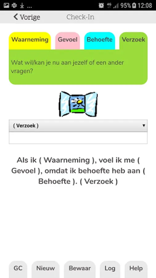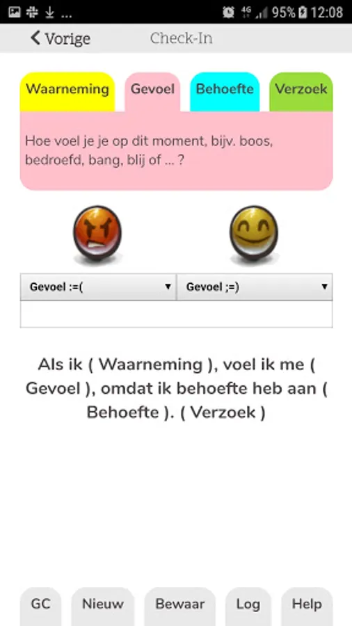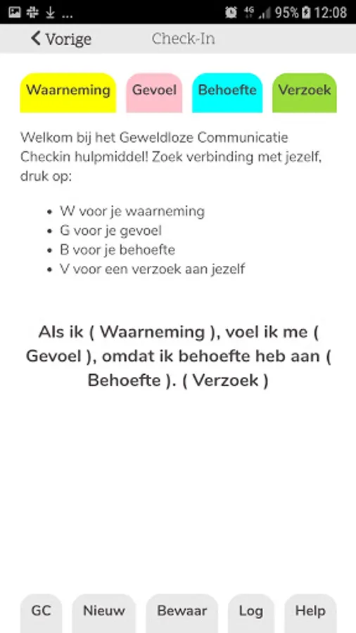 The iGCCheckIn app helps you in times that you need to connect with yourself or another. Using the model of nonviolent communication, you will gradually become aware of what you've seen, what you feel, what you need and what you could do to achieve this.