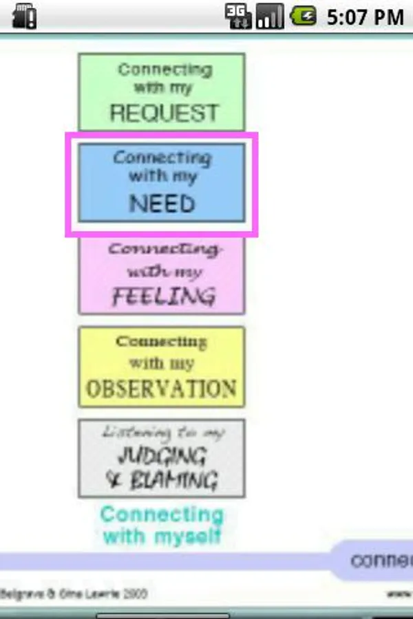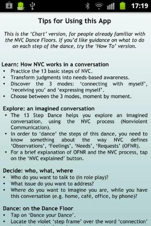 This ‘CHART’ App is designed for people who are familiar with the NVC Dance Floors. It is a great way to have the 13 Step Dance, a feelings list, a needs list, and an intention reminder, in your pocket, ready to untangle your day’s experiences on the way home, and prepare for tomorrow!