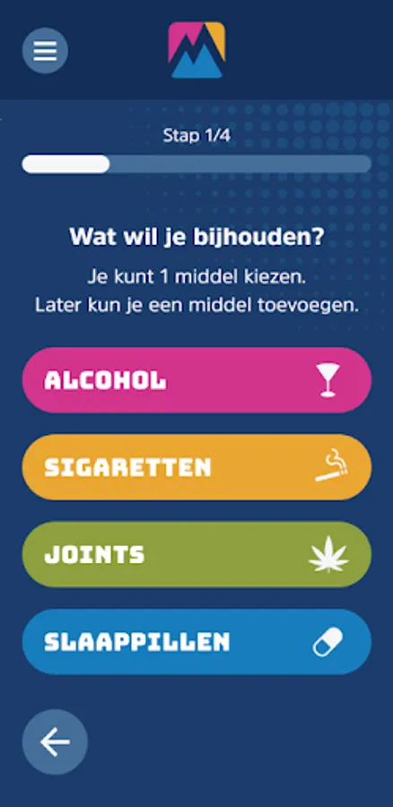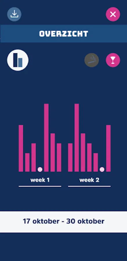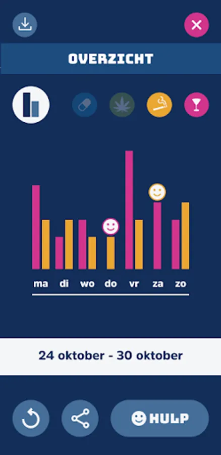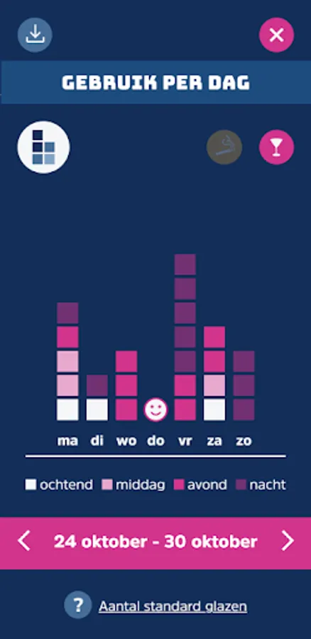 The Resource Meter helps you register the use of alcohol, tobacco, cannabis and/or sleeping pills and tranquilizers. With the Resources Meter you can keep track of your use for a period of 1, 2, 3 or 4 weeks. This can also be done from several resources at the same time. You can indicate your use per day or per part of the day. Using the app is completely free.