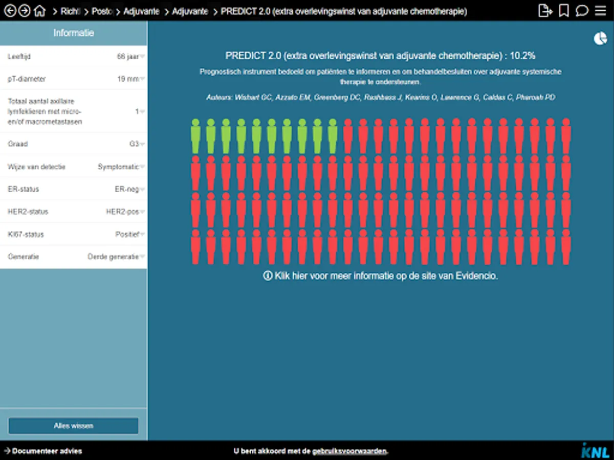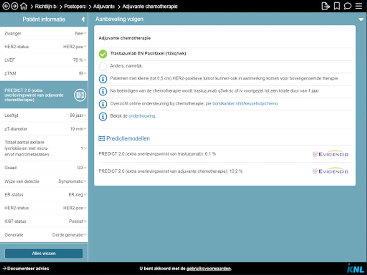 • The link with Prediction models. To coordinate treatments with the individual patient, doctors can use guidelines and prediction models. Evidencio and IKNL have together made the models available in Oncoguide. This provides the doctor and patient with better support in decision making about the treatment.