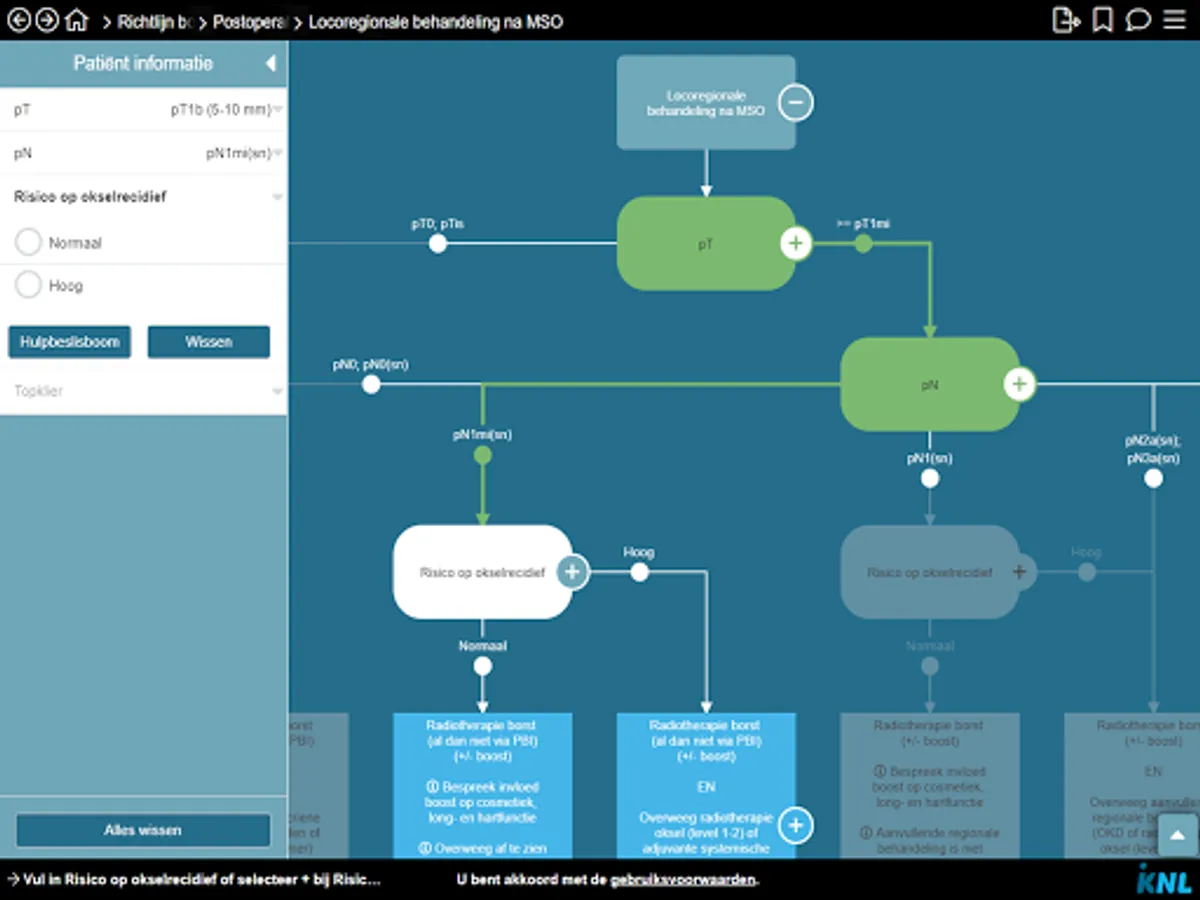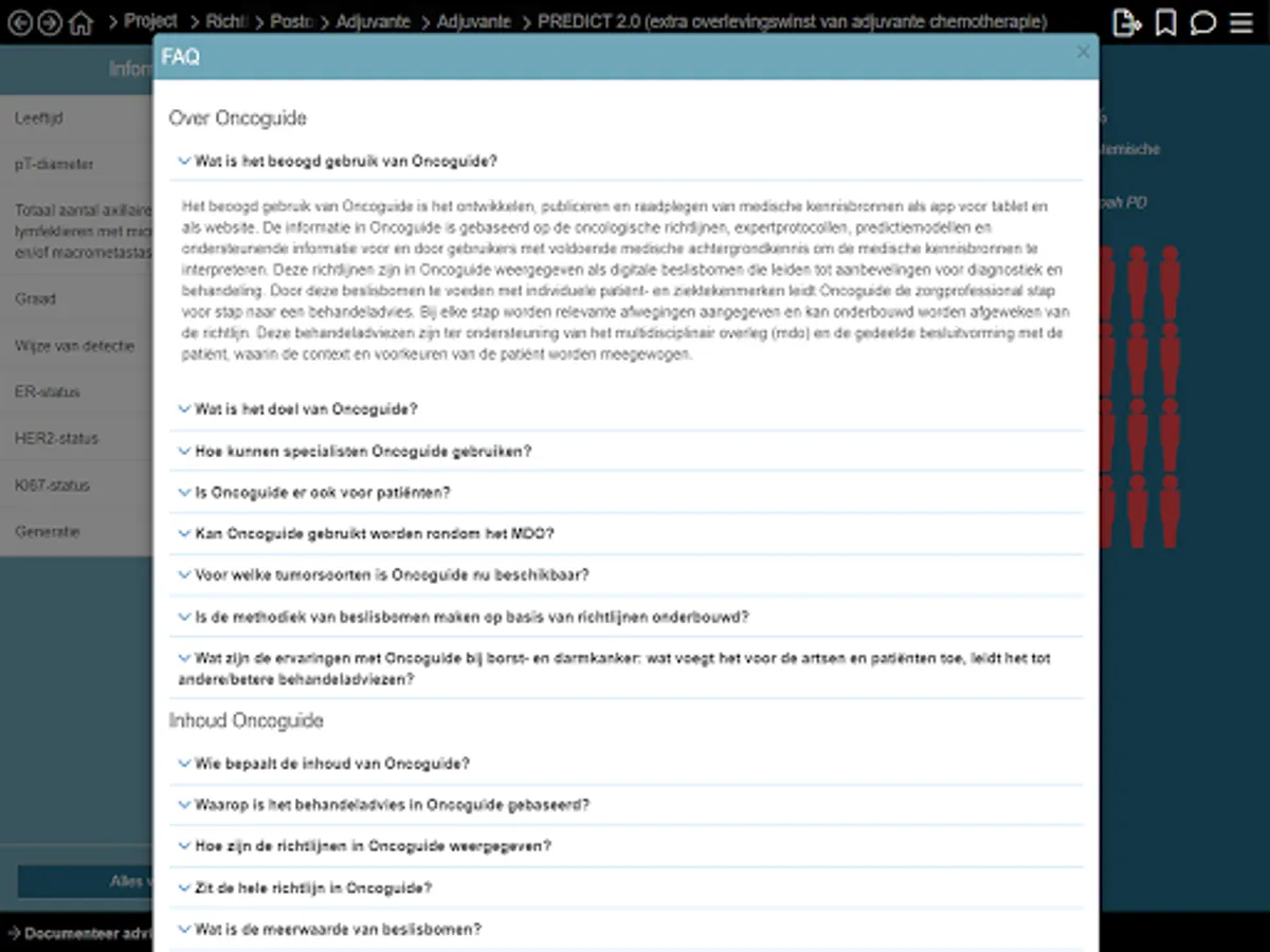 Oncoguide is a digital decision support available as an app for tablet and as a website. The information in Oncoguide is based on the oncological guidelines. These guidelines are presented in Oncoguide as digital decision trees that lead to recommendations for diagnostics and treatment. By feeding these decision trees with individual patient and disease characteristics, Oncoguide guides the health care professional step by step to a treatment advice. At each step relevant considerations are indicated and substantiated deviation from the guideline can be made. These treatment advice is to support the multidisciplinary consultation (mdo) and the shared decision-making with the patient, in which the context and preferences of the patient are taken into account.