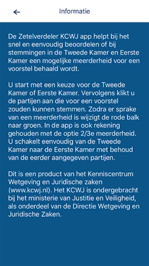 You start with a choice for the House of Representatives or the Senate. Then click on the parties that could vote for a proposal. As soon as there is a majority, the red bar changes to green. The app also takes into account the 2/3 majority option. You can easily switch from the House of Representatives to the Senate while retaining the previously indicated parties.
