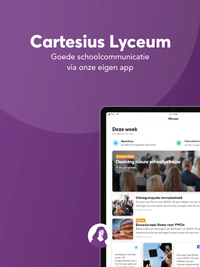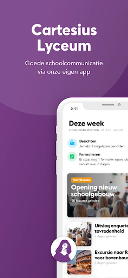 Are you a parent, student or employee of the Cartesius Lyceum? Download the Cartesius Lyceum app now and log in with the data you received by email. Didn't receive an invitation, but always had the latest news from the Cartesius Lyceum in your pocket? This is also possible without a login!