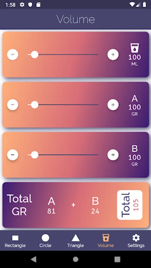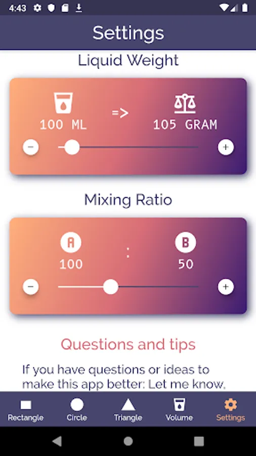Slider two: Here you indicate the number in liquid A. The result is how much you need to add of liquid B and the total. For example if you have added too much of liquid A.
