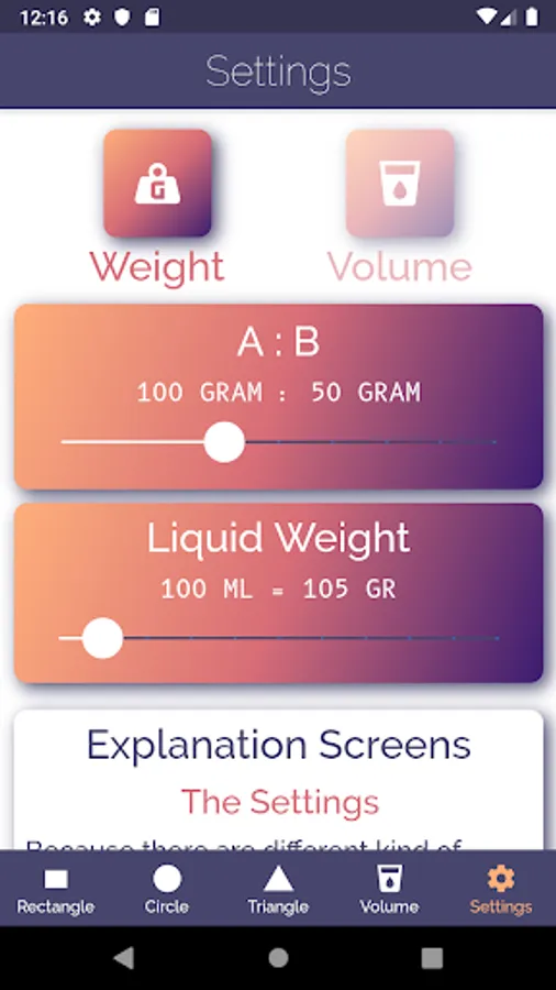 First you indicate whether you work with volume or with weight. If you click on the volume button, the screen showing how many grams of 100 ml epoxy weighs, disappears.
