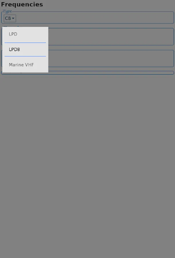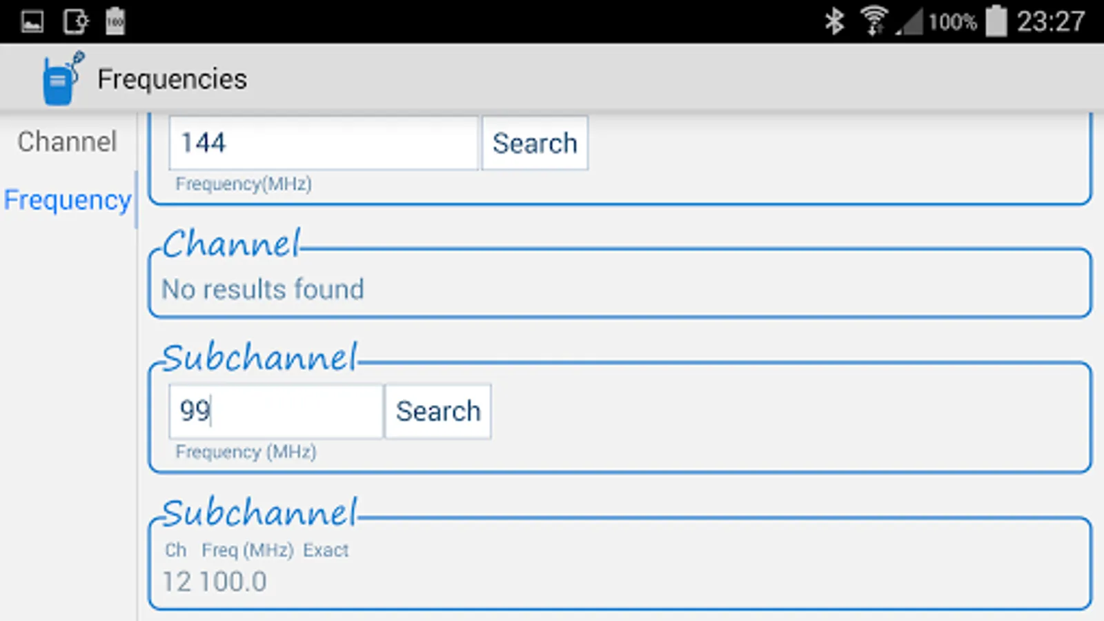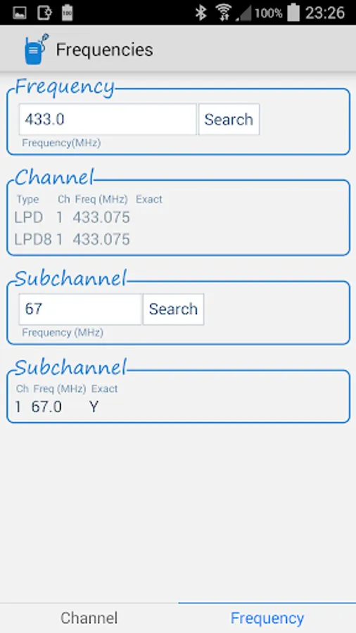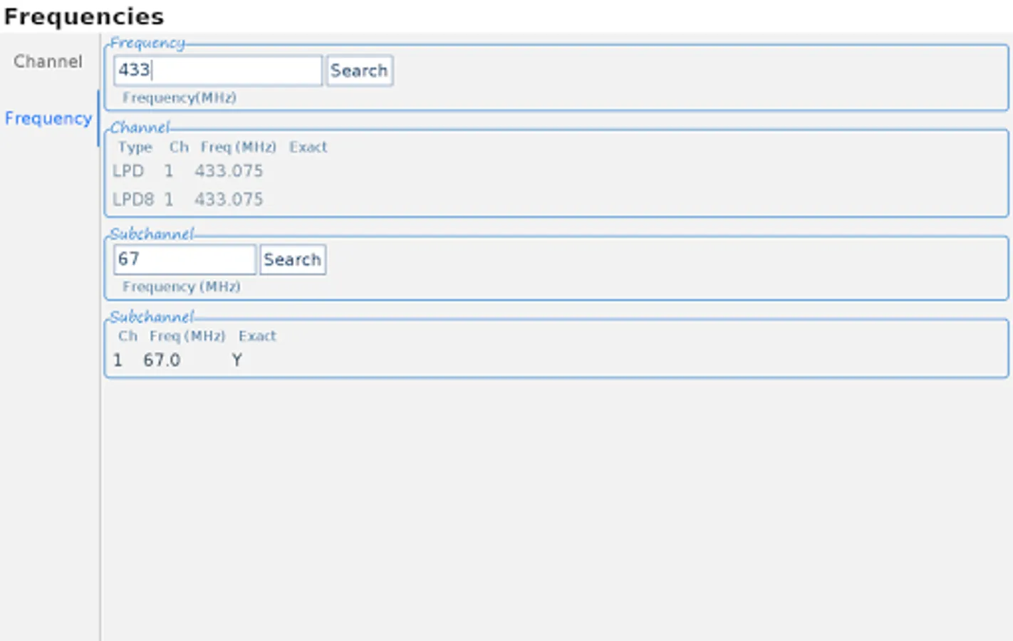 Or select the frequency (of a channel or subchannel) and the nearest channel will be shown, if it is nearby the given frequency. Select the tab 'frequency' at the bottom of the app to make use of this functionality.