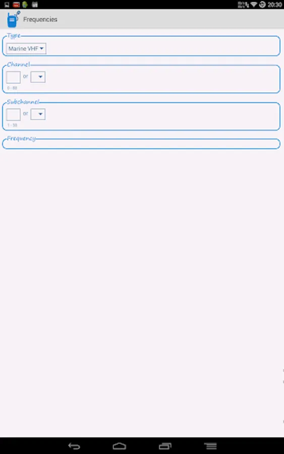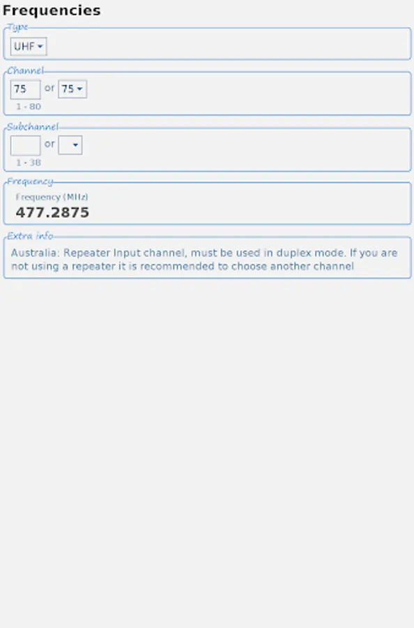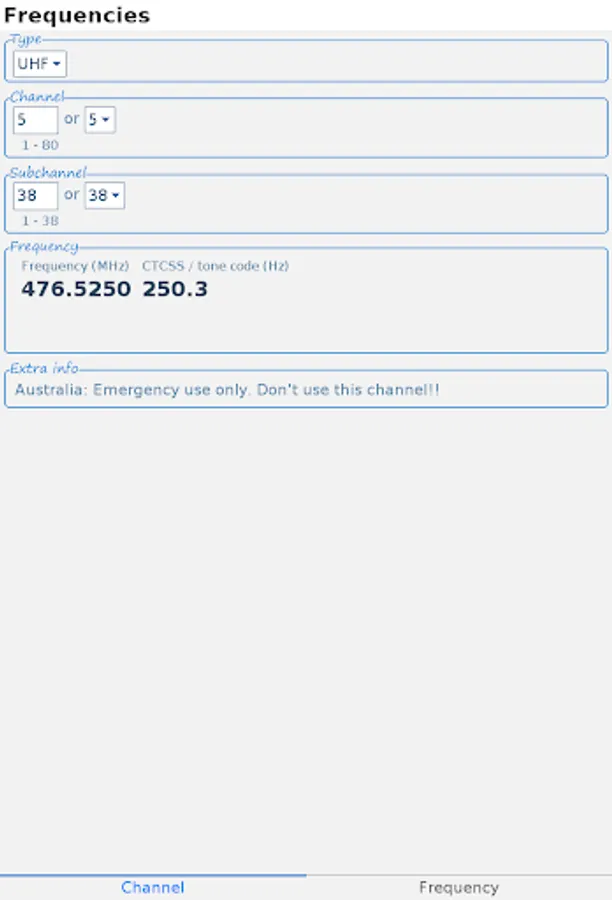 Select which type you need and select the channel and subchannel. The app calculates / converts the channel. The frequency (in MHz) and CTCSS frequency (in Hz) / tone code are then shown.