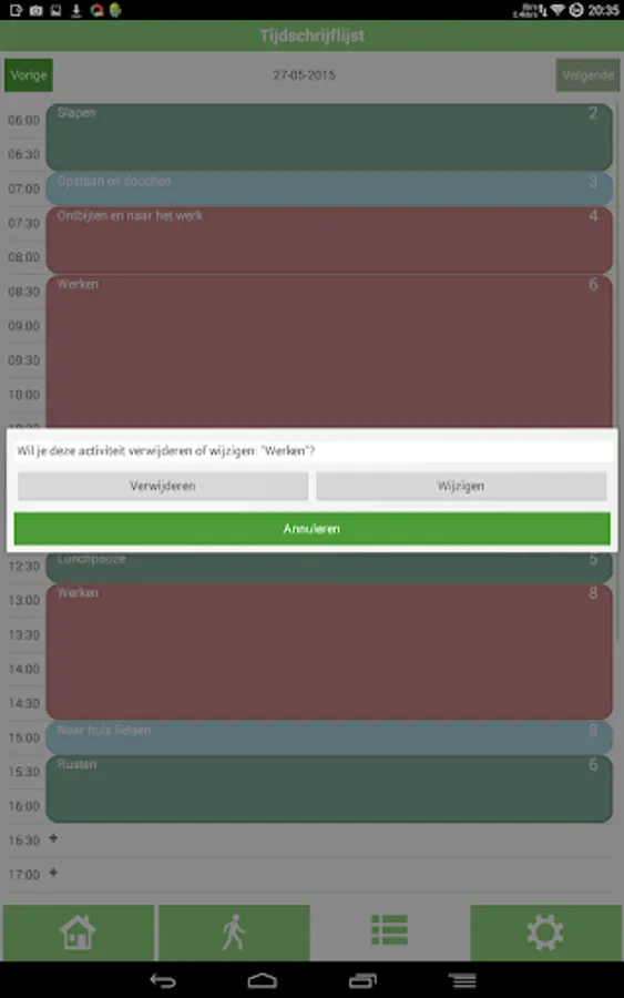 - In the activitylist, you can see which activities you did until now: blue activities are neutral, green give energy, red cost energy. You can also add a new activity by clicking on the '+' in the list and edit your activities.