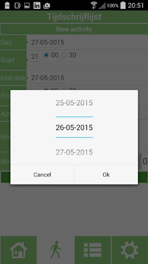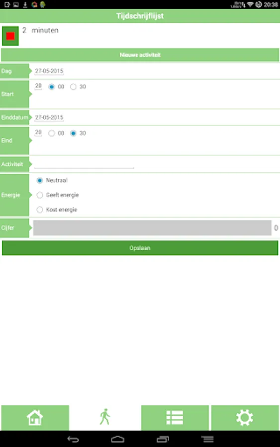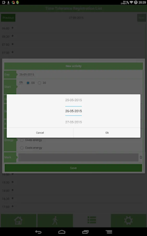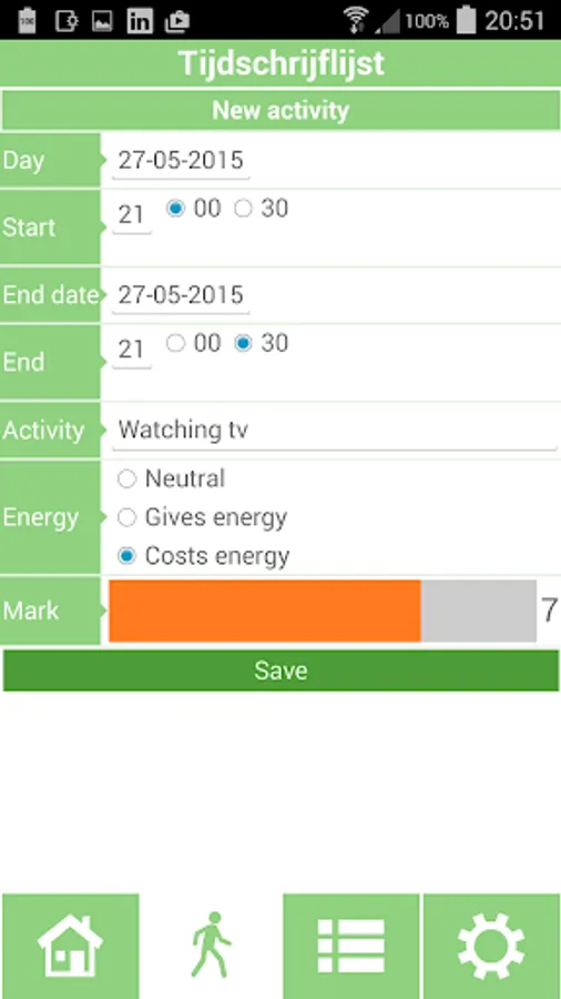 - In the activity screen, you can add a new activity. Give your activity a mark (energy level), 0 is not tired at all, 10 is you can't do anything anymore because of the tiredness.
