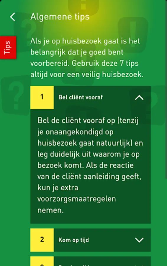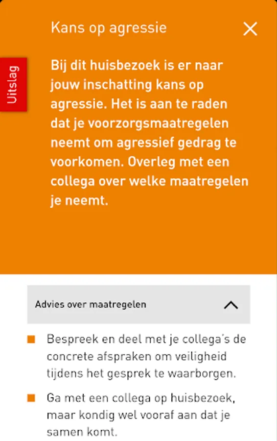 If (youth) care professionals have to make house calls with unpredictable factors that affect your safety. Moreover, you stand there in difficult situations, often alone, with no peers in the region. This requires a different approach when it comes to safety on the job. With this app you can as ambulatory working himself before a home visit is to assess the risks of aggression and take the proper precautions.