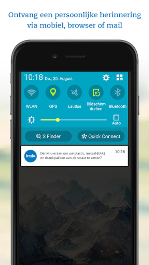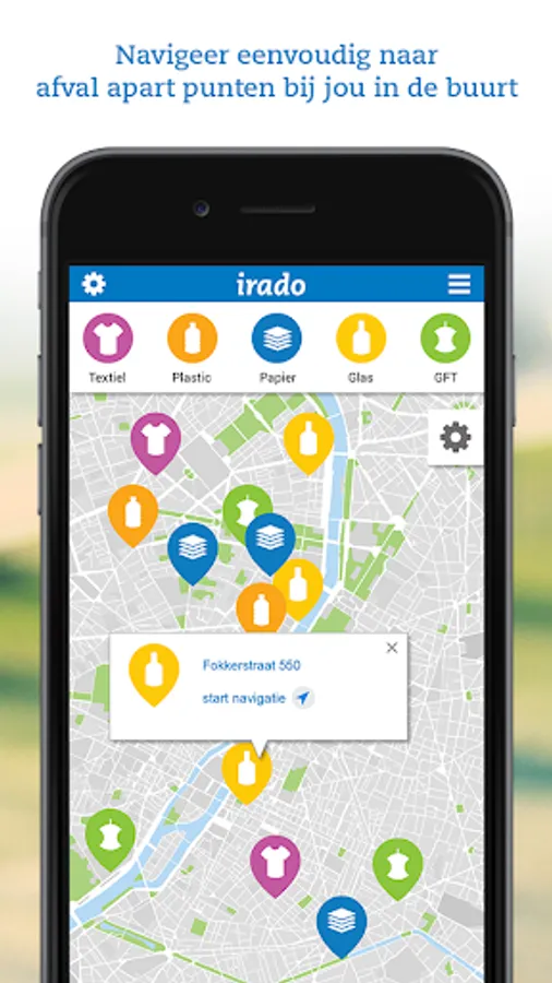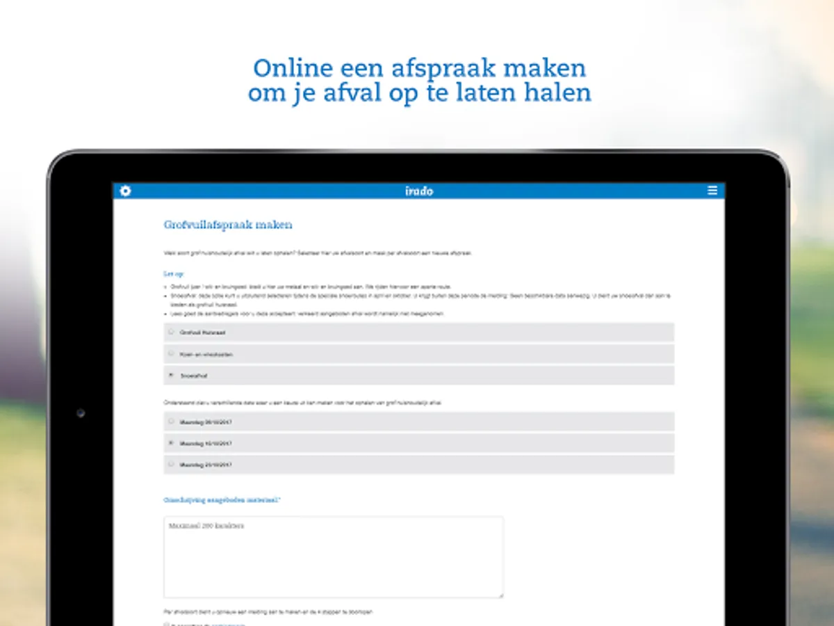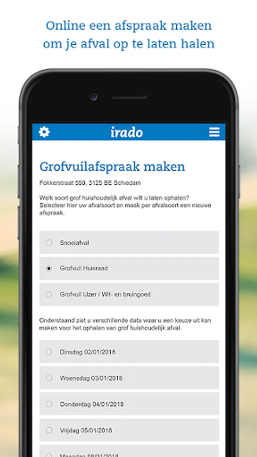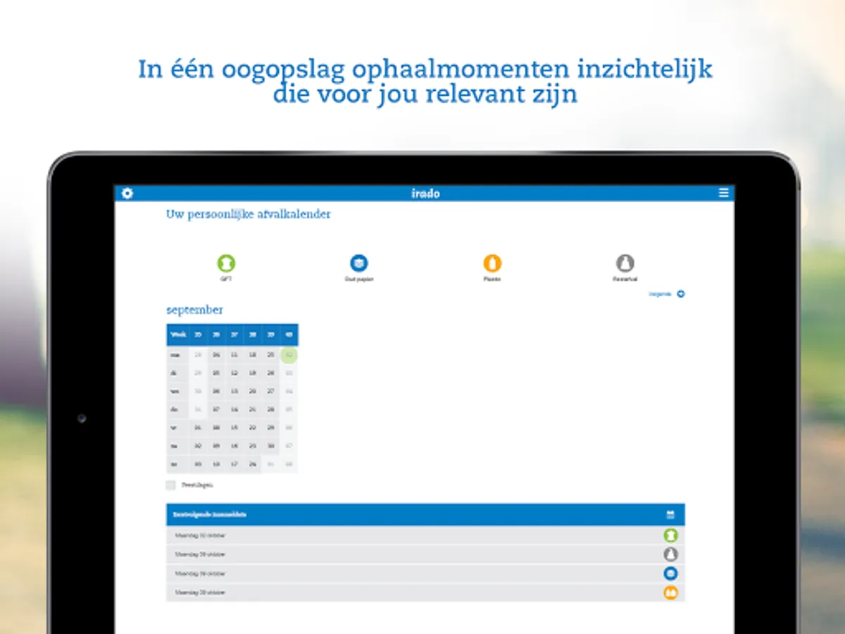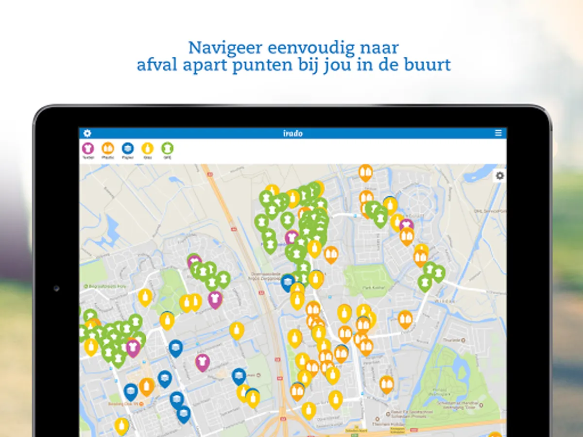The App offers Irado inhabitants of Schiedam, Vlaardingen, Rozenburg and access to personal waste calendar, a list of upcoming collection times by type of waste and the ability to set a reminder. The app provides an overview of waste separate points near and digital can be scheduled an appointment to pick up trash.