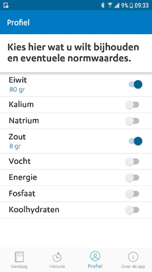 - You have a protein-restricted diet of up to 70 grams of protein, with a sodium restriction of 2400 mg (this equals 6 grams of salt) and a potassium restriction of 3000 mg. You then set the norm value protein to 80, the norm value sodium to 2400, salt to 6 and potassium to 3000. This way you can manage all your goals around your diet.