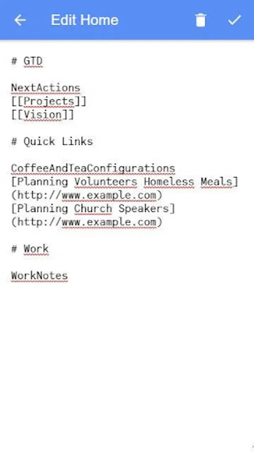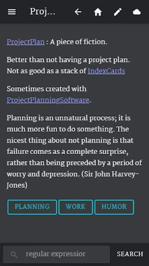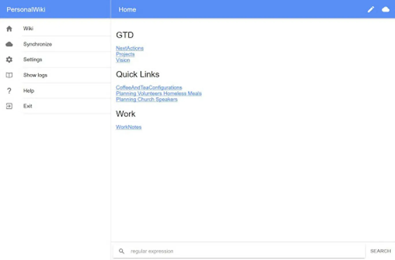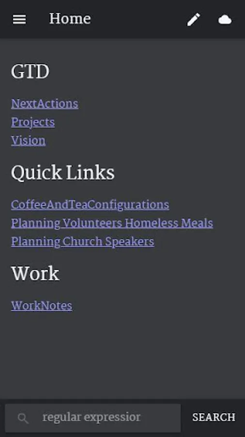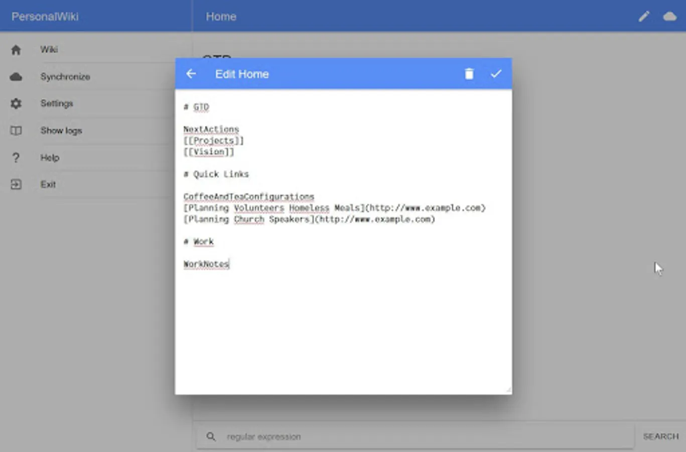 The Personal Wiki app enables you to take notes in a structure you can create an manage freely, like a website. Using wikiwords you can create notebook with linkable pages for tracking your ideas, information, todo lists, tasks, bookmarks, projects, notes, brainstorms - in short, your life - in the most flexible way.