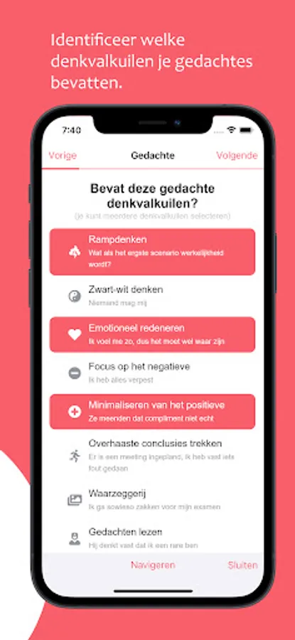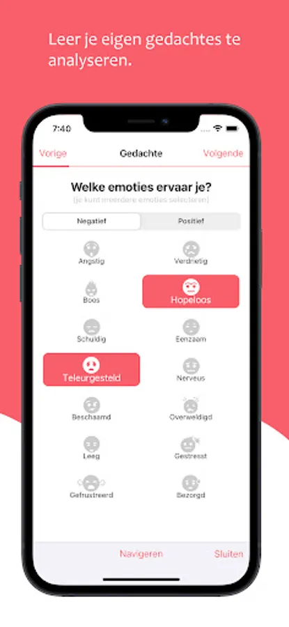 Thought Grip helps you at the moments when your emotions flare up to see which negative thoughts are going through your head. We help you to see which thought is most responsible for your feeling. We will then analyze this idea. We check whether you might make pitfalls and whether the thought is correct, for example. By doing this analysis often, you can break your thinking patterns and you will also feel better in certain situations.