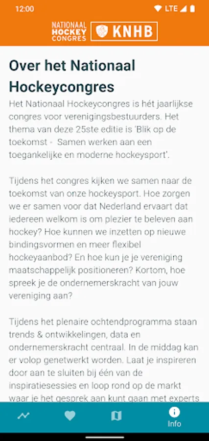 On Saturday, February 11, 2023, the KNHB is organizing the 25th edition of the National Hockey Congress. The theme of the congress is 'Look at the future - Working together on an accessible and modern hockey sport'. We have put together a nice program for you in which there is plenty of room for networking. In this app you will find the program of the National Hockey Congress.