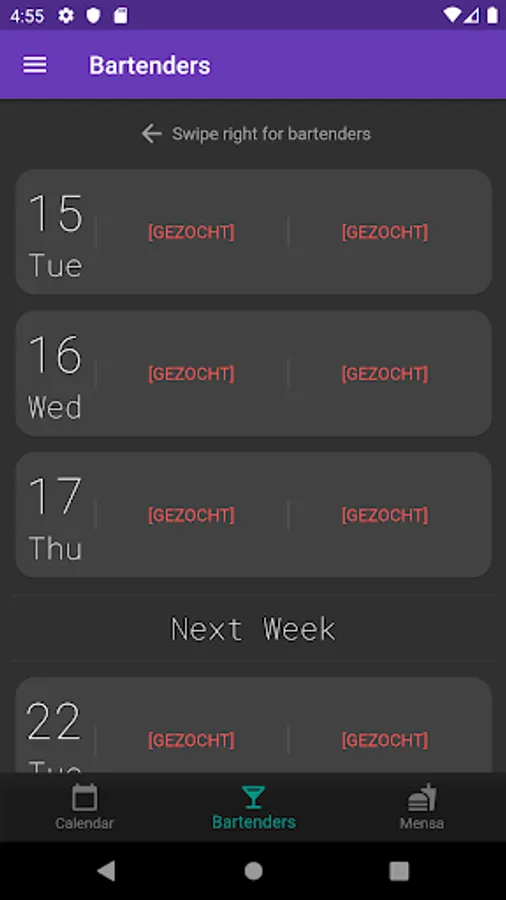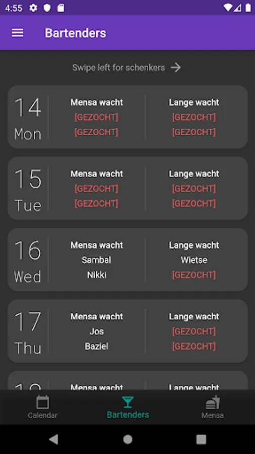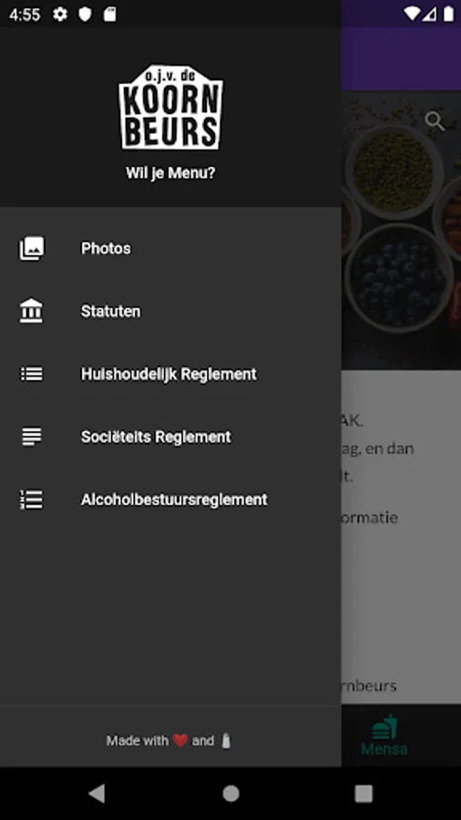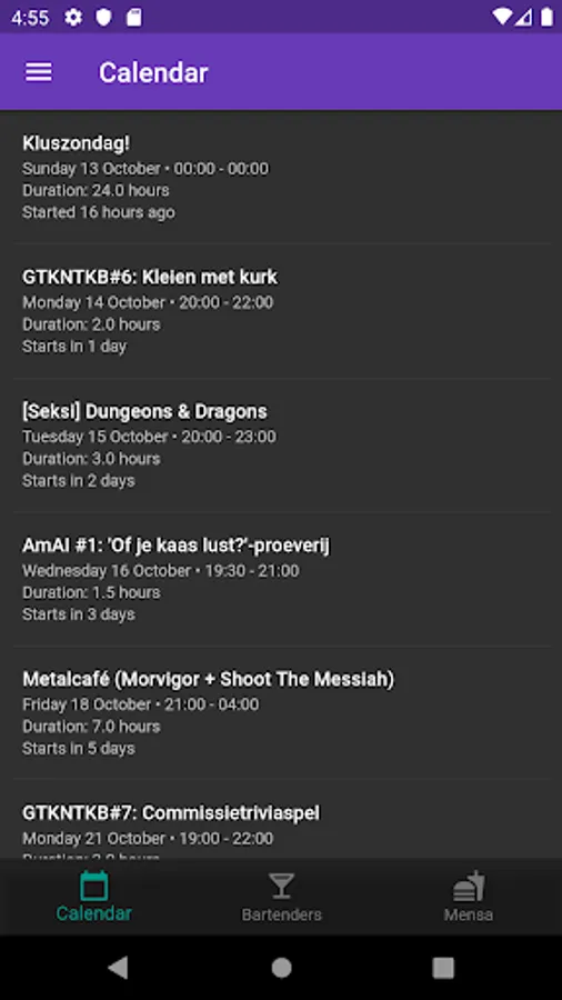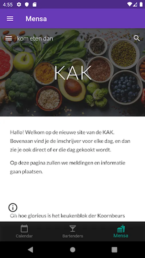 In de app kan je alle aankomende events terug vinden, zien wie er staat te tappen of schenken de komende 2 weken, inschrijven voor de mensa als er een inschrijver is, foto's bekijken van event's en als kers op de taart, de statuten, HR, SR en ABR snel openen en lezen zonder gedoe.