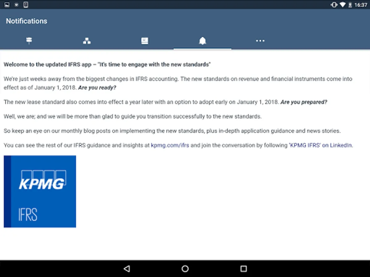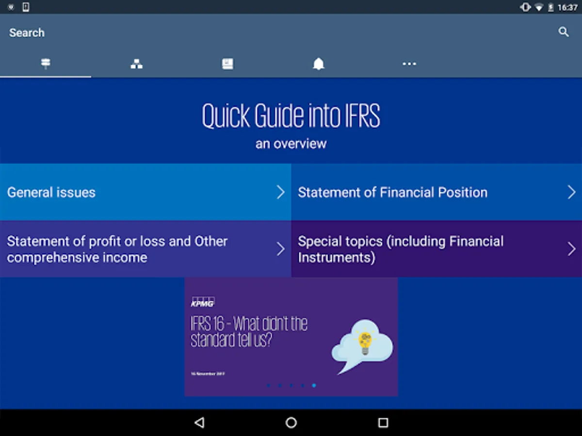 The KPMG IFRS App helps gaining a quick insight in the International Financial Reporting Standards (IFRS). The app provides the basis of accounting under IFRS to finance professionals who want to get familiar with specific accounting topics.
