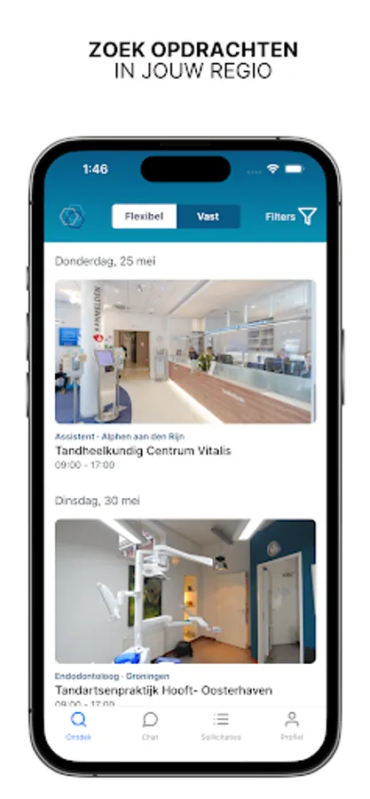 Quickly and easily find temporary work or substitute workers in oral care with the DentalCens FlexApp! This app connects employers and freelancers in the dental care sector, giving you access to an extensive network of professionals and vacancies anytime, anywhere.