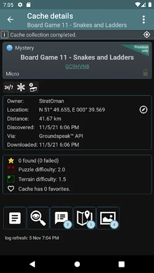 Basic members of this site can see distance, location and details of a cache, but can only load full details of three caches a day (description, waypoints, images). Also, information about premium caches is very limited.