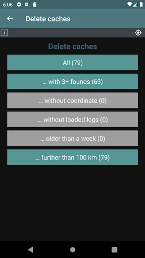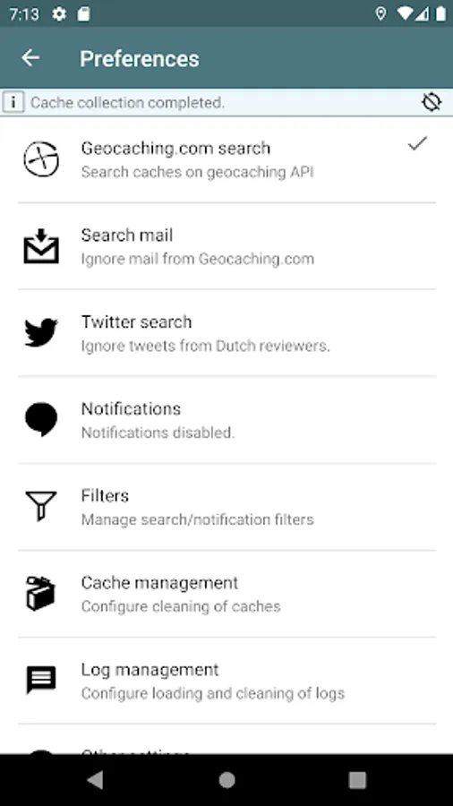 The application offers creation of profiles with which the cache list can be filtered on distance from a certain location, type, difficulty, etc. There is an active profile for the list view as well as an active profile for alerting.