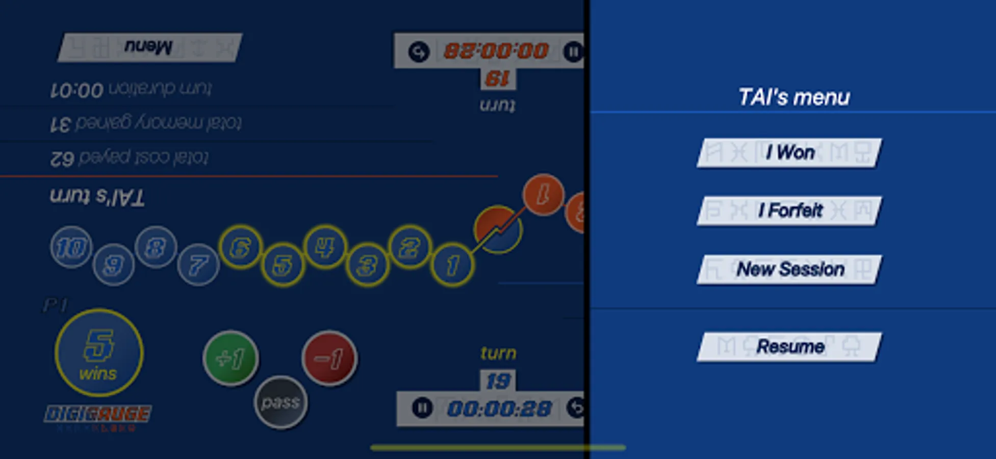 Sessions are automatically saved on your device, so you can pick where you left off. Facing another opponent today? You can also start a new session using the menu button.
