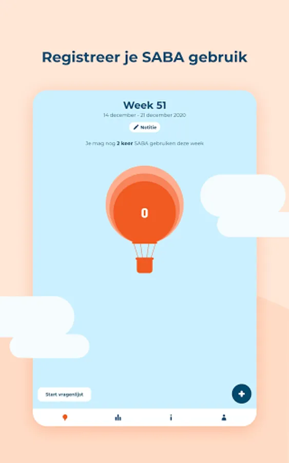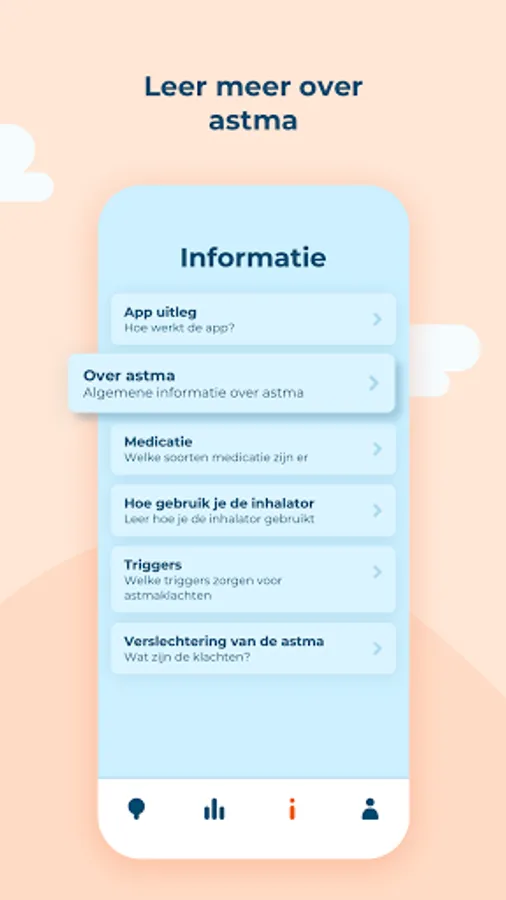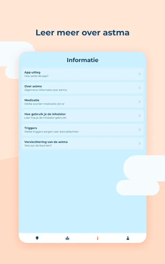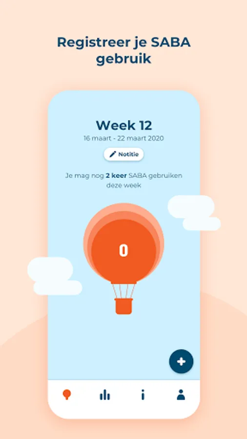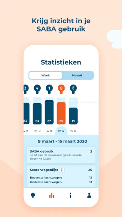 In the Asthma app you keep track of when you use short-acting bronchodilators (SABAs), how you feel and what the (possible) cause of your complaints is. Based on your information, you will gain insight into your use of SABAs and how this relates to your asthma complaints and the causes (triggers) of these complaints.