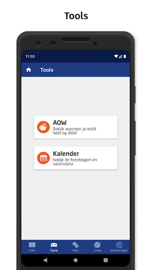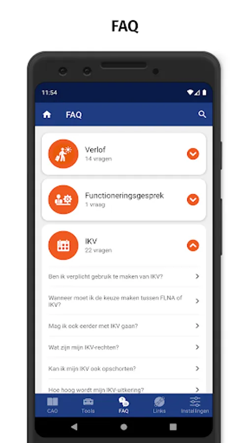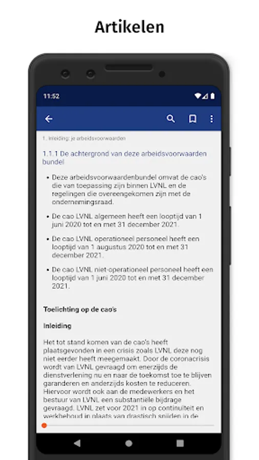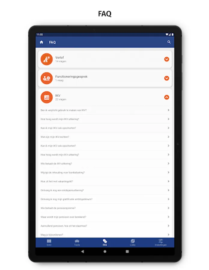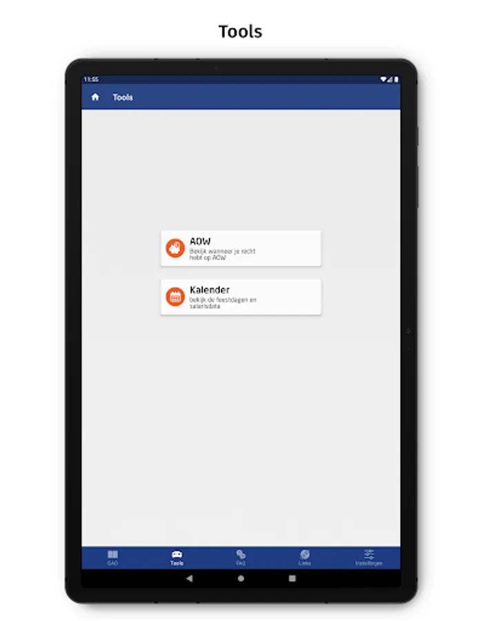 The Cao LVNL app contains the full texts of the LVNL CLA. All items can be searched easily with the search function. In addition, the app offers useful tools, frequently asked questions, a calendar and additional information about CLA-related topics.
