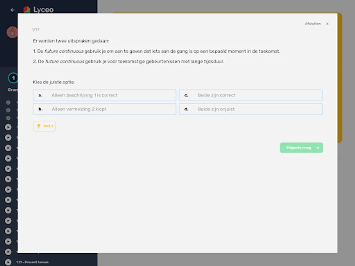 With the help of Lyceo Practicing you can easily practice for upcoming tests, so that the lesson material is better understood. The practice exercises have been set up by experienced trainers and tested by teachers and students. The exercises are based on the most commonly used methods in the Netherlands, so there is a good chance that those of your school are included. Practice now for Mathematics, Dutch, English, Economics and Chemistry.