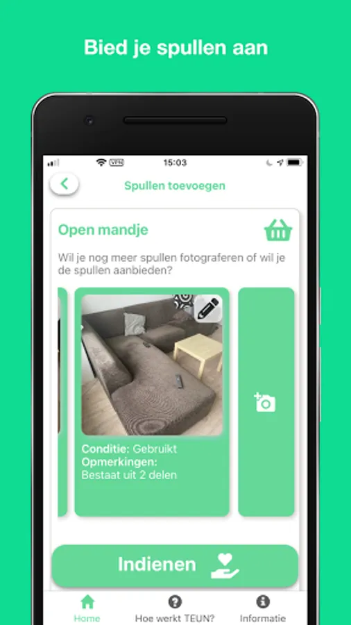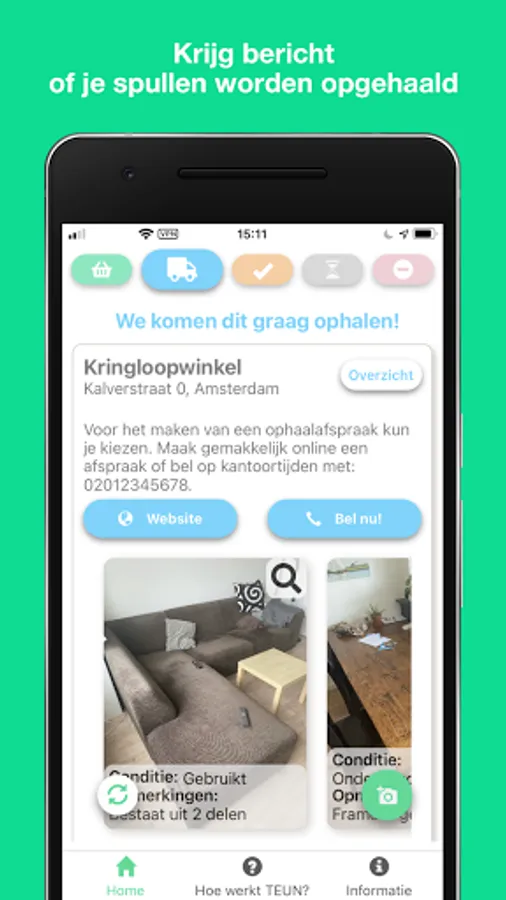 With TEUN you take pictures of the things you want to get rid of. Member organizations view those photos via their TEUN 'dashboard' and let you know very quickly whether they can do something with it. With TEUN, your stuff ensures happy people, social workplaces and a better environment.