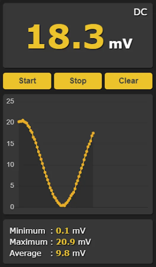 Receive data from your OWON multimeter directly on your phone over bluetooth. See fluctuations in a chart, collect minimum, maximum and average values.
