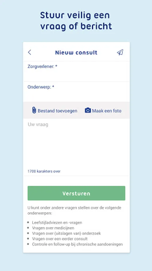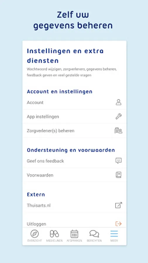 In collaboration with your healthcare provider, the Uw Zorg Online app offers you direct access to your medication overview as known to your GP, you can order previously prescribed medication, make appointments and start an eConsult!