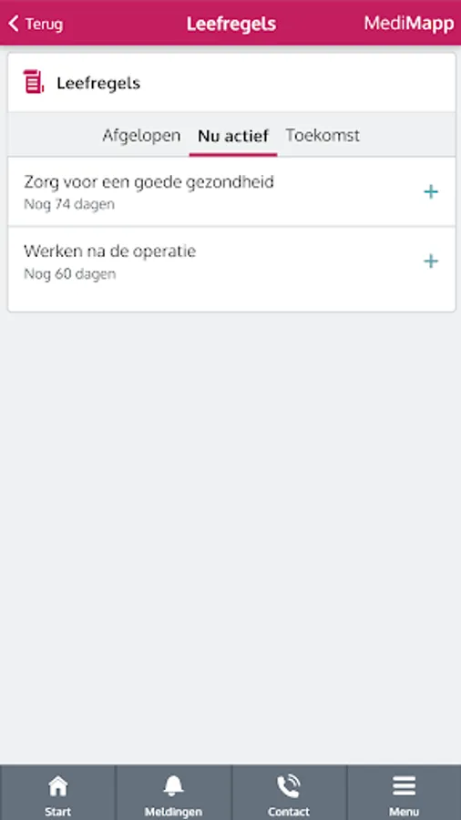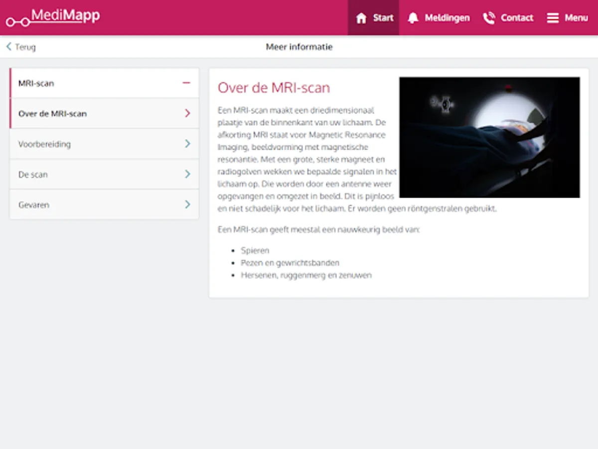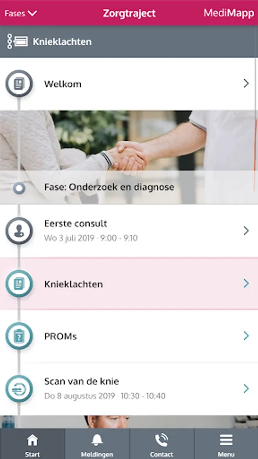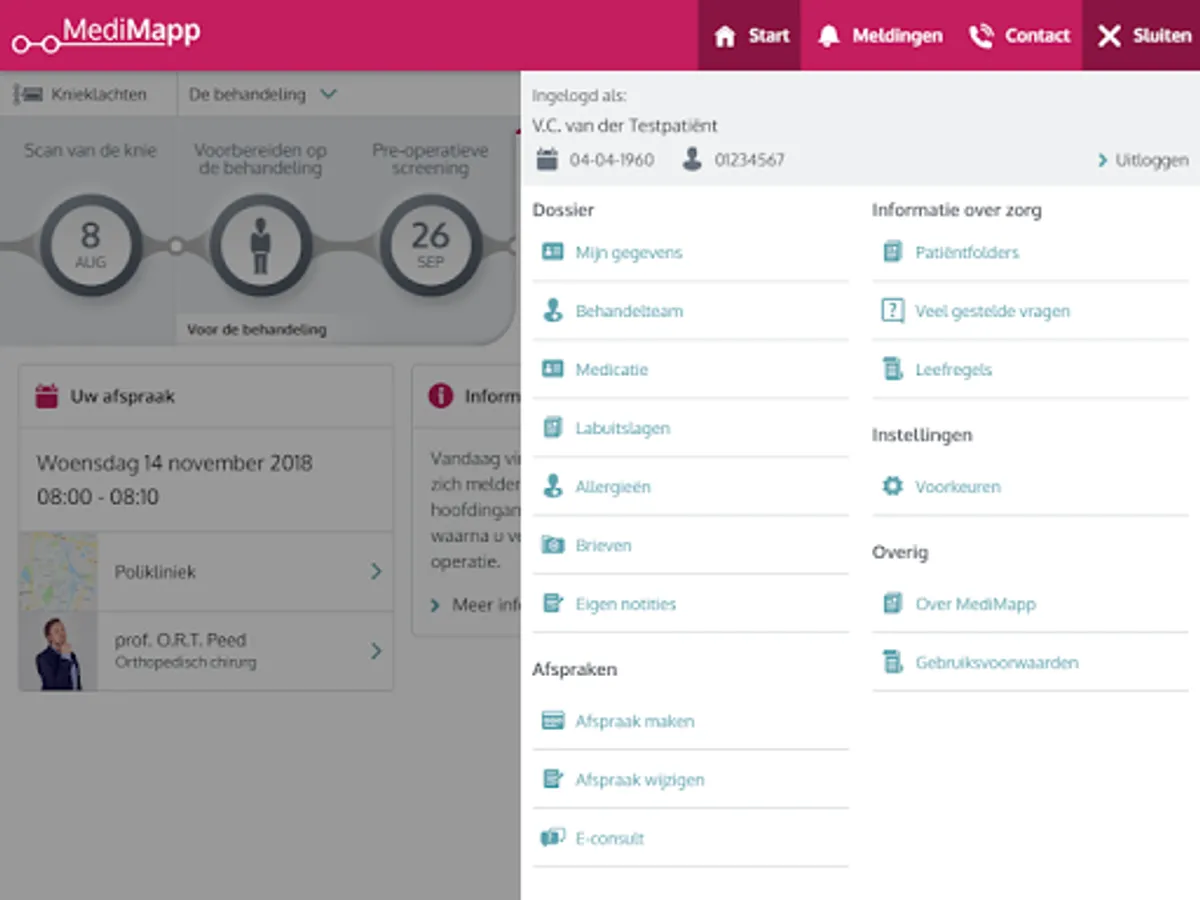 MediMapp gives you the right information at the right time about your illness and care trajectory. Here you will find everything about the syndrome, (treatment) agreements, side effects, life rules and frequently asked questions. The information is always up-to-date, specific and relevant through a link with the Electronic Patient File of your healthcare institution.
