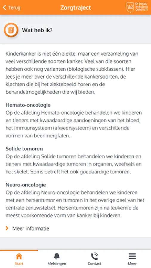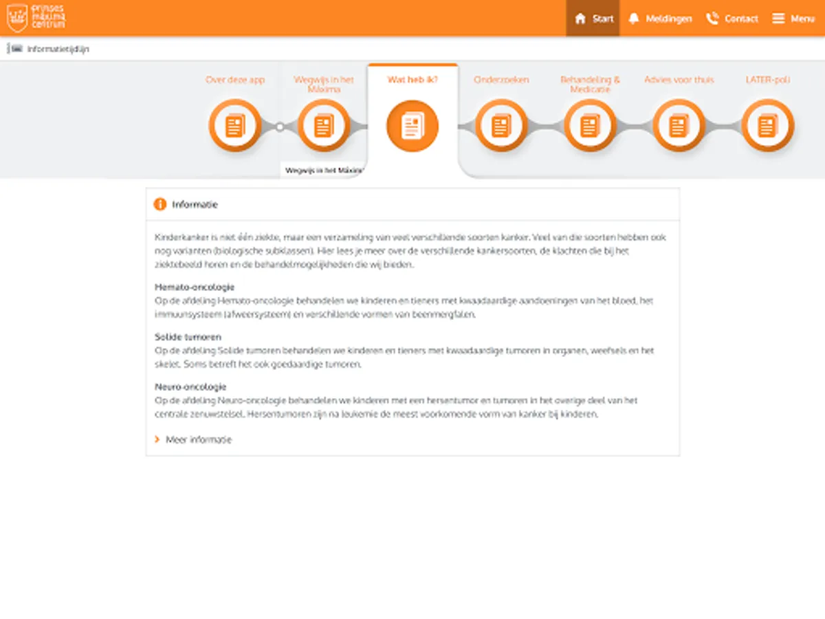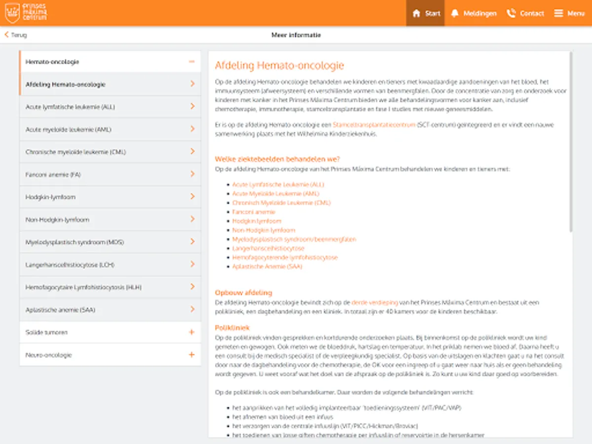 MijnMáxima is de app voor kinderen en ouders van het Prinses Máxima Centrum. Hier vind je alle informatie die je nodig hebt voor een goede voorbereiding en als ondersteuning tijdens de behandeling. Bijvoorbeeld informatiefolders, leefregels en contactgegevens. Daarnaast ontvang je via deze app meldingen over belangrijke zaken, zoals urgente maatregelen in het ziekenhuis. In de nabije toekomst zal deze app uitgebreid worden zodat je steeds meer functies beschikbaar krijgt.