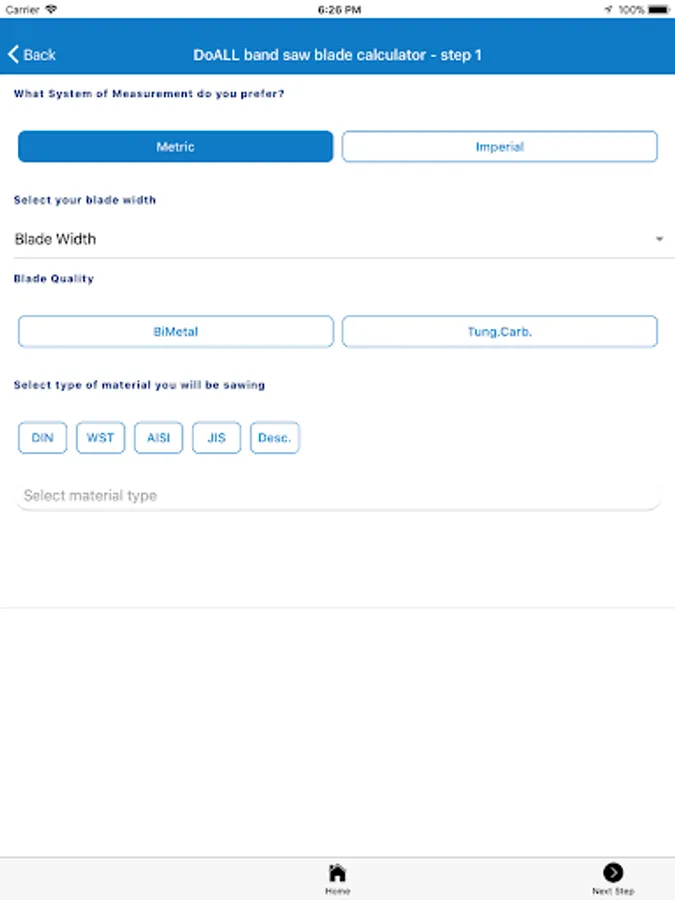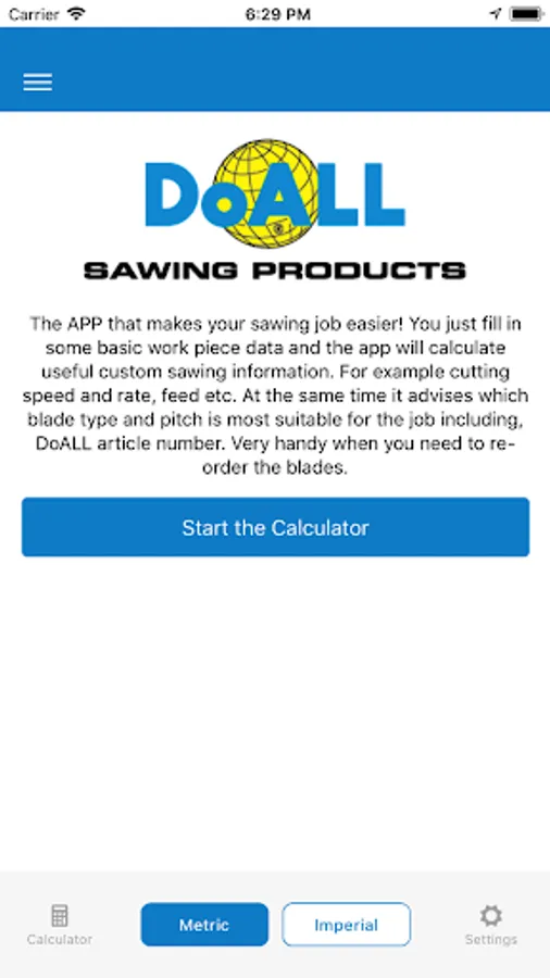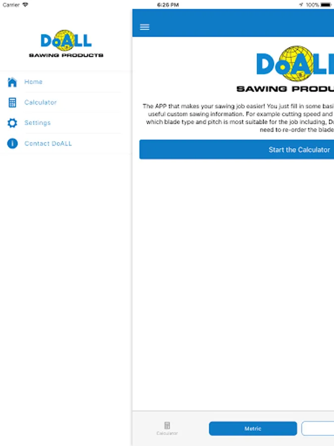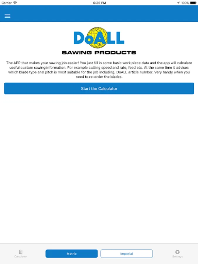 The DoALL band saw blade calculator APP that makes your sawing job easier! Just fill in some basic work piece data and the app will calculate useful custom sawing information. For example cutting speed, rate, and feed etc. At the same time it tells you which blade type and pitch is most suitable for the job. Including DoALL article number. Very handy when ordering blades!
