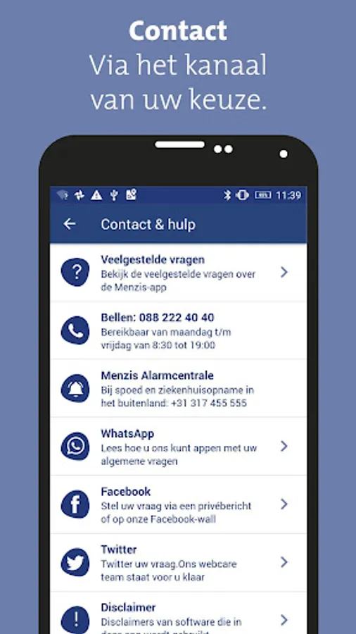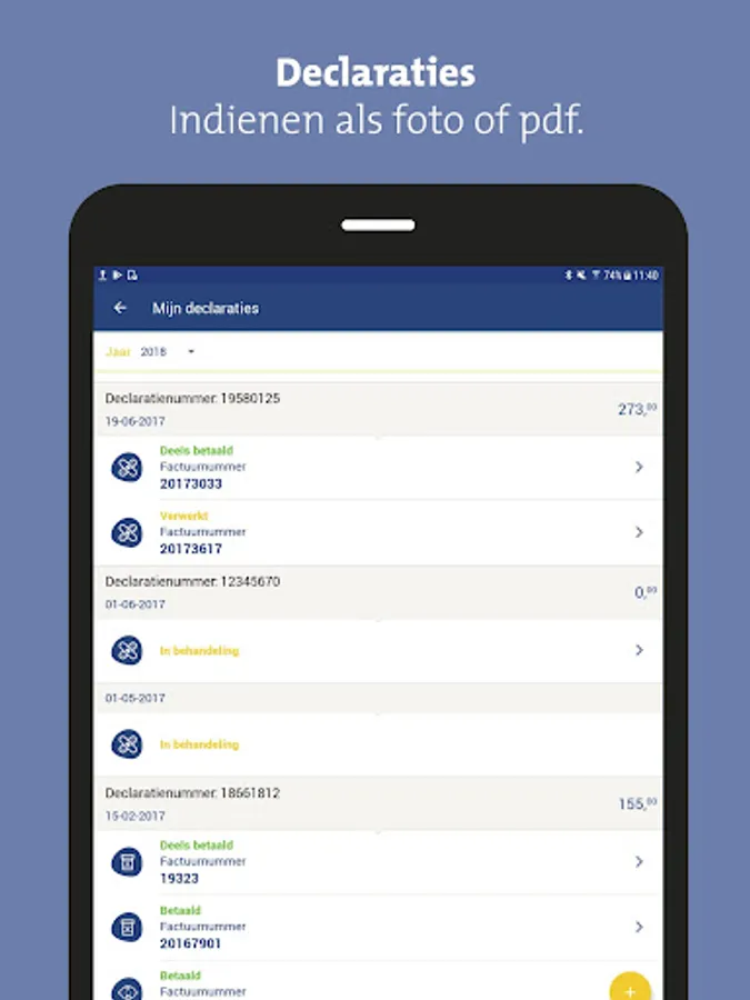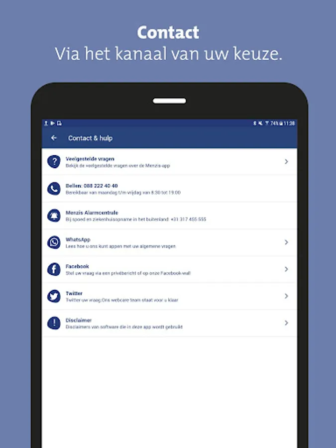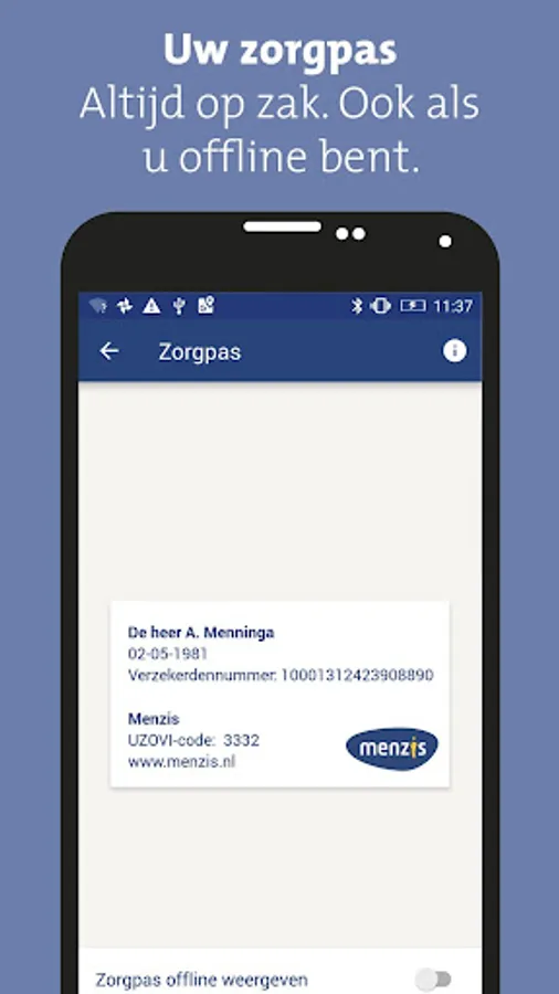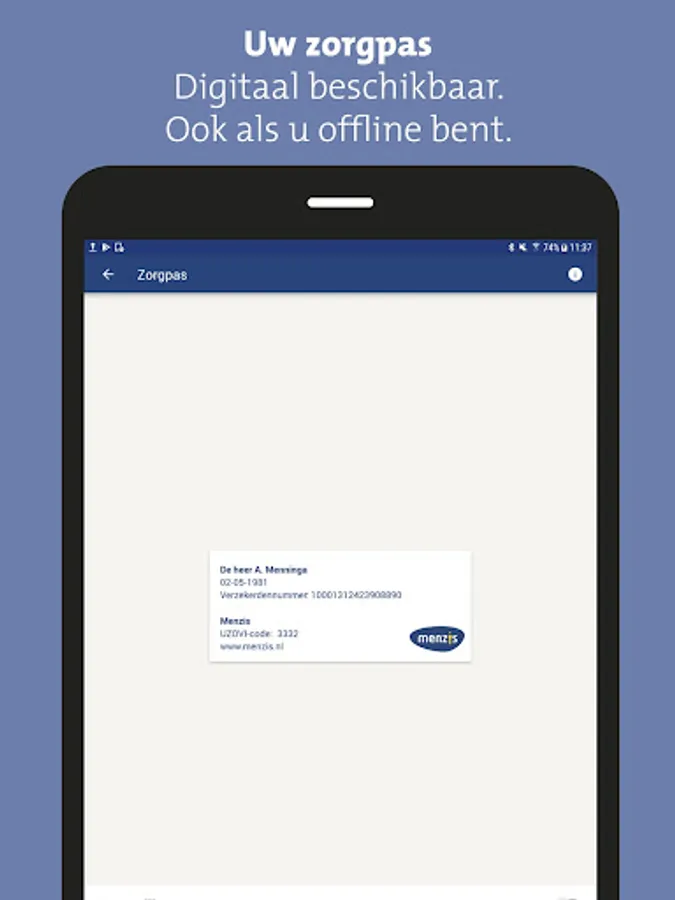 The Menzis app contains many useful features. You open the app by fingerprint or by themselves to set PIN. You can declare by taking a picture of sending the note or pdf. You always have an overview of your invoices. Also found in the app your insurance information and questions please contact us via the app. And because today we almost always have a phone in your pocket, is the health card in the app and is also available offline.