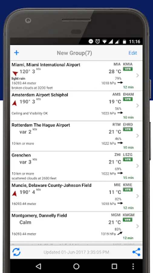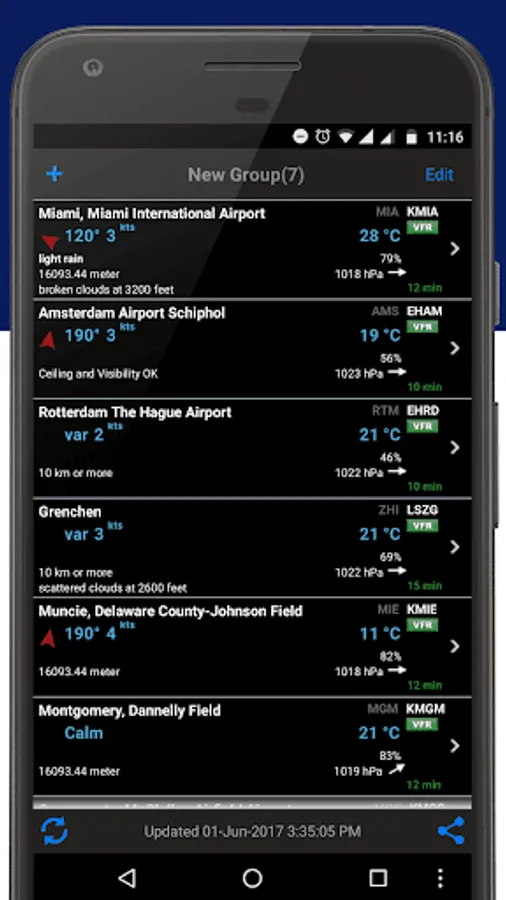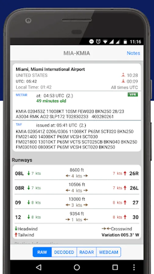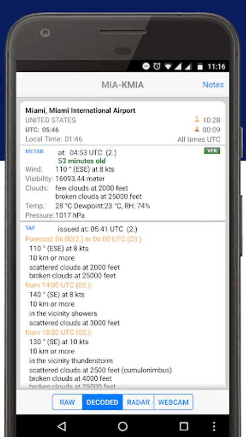 Get current and precise weather conditions (METAR) as well as weather forecasts (TAF), which are used by pilots for their flight preparations. You can choose worldwide airport weather stations from the built-in database by either name, ICAO or IATA code. Data will be shown in its original format or fully decoded into easy understandable texts.