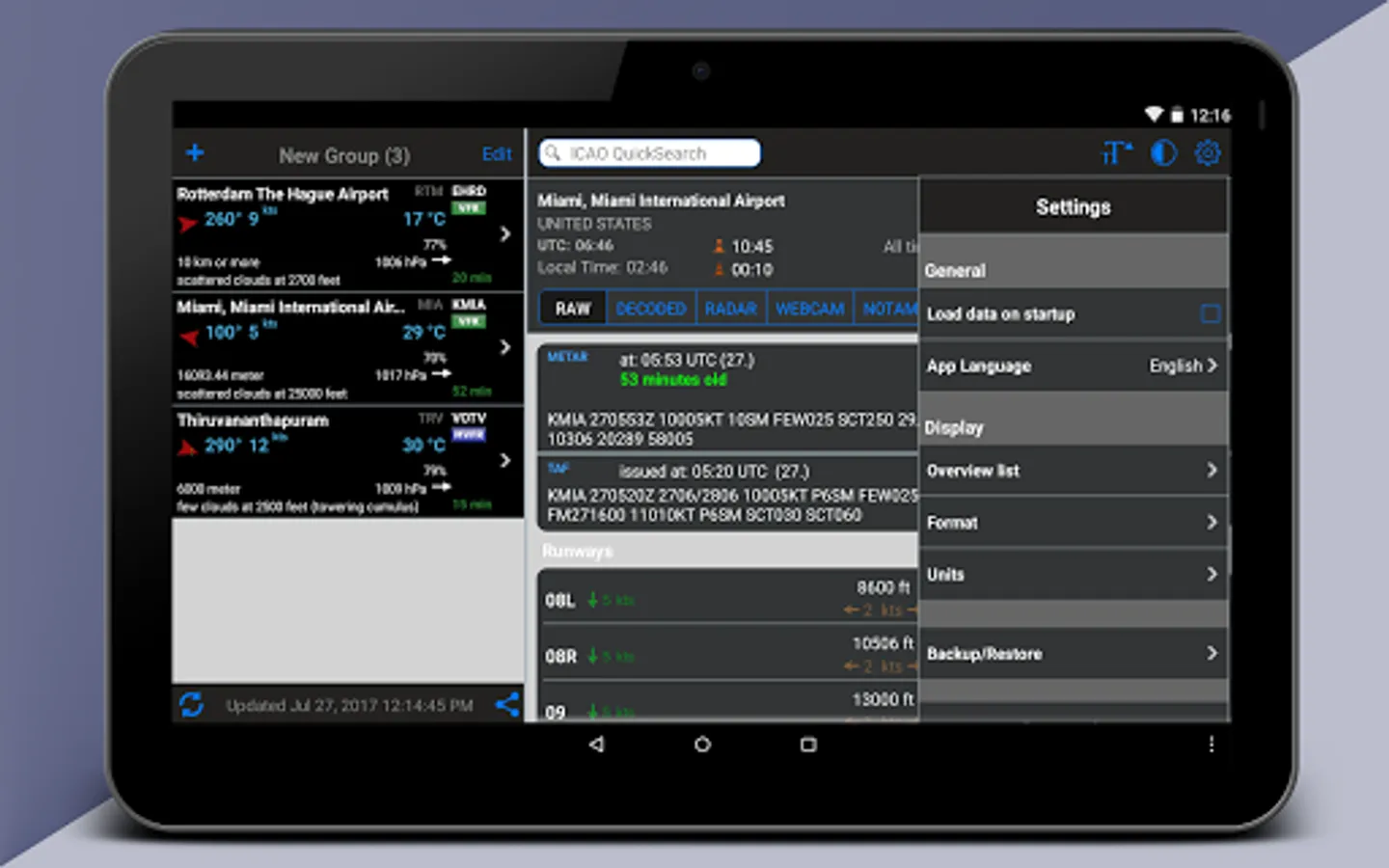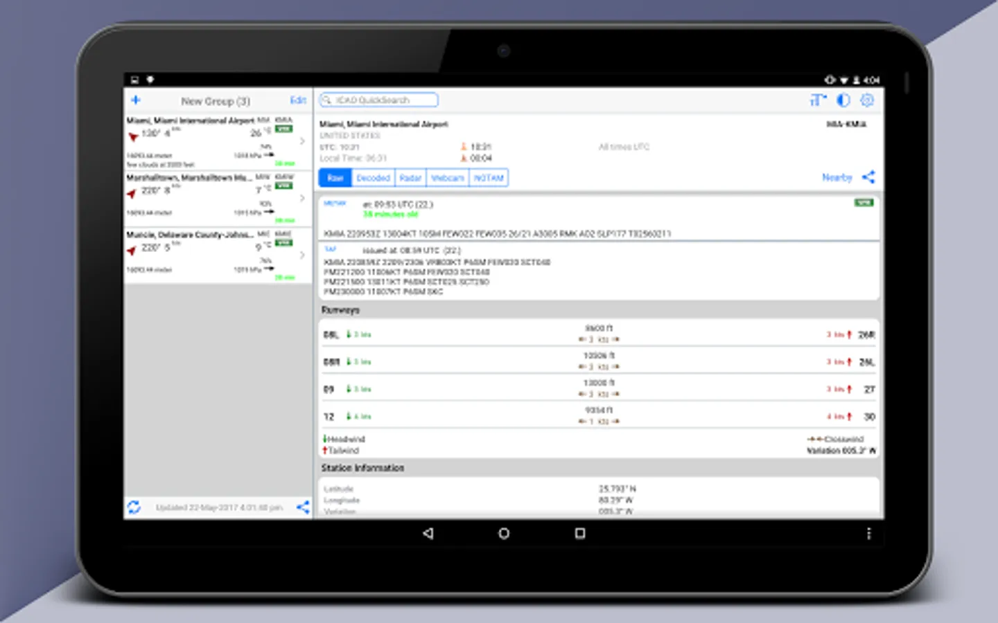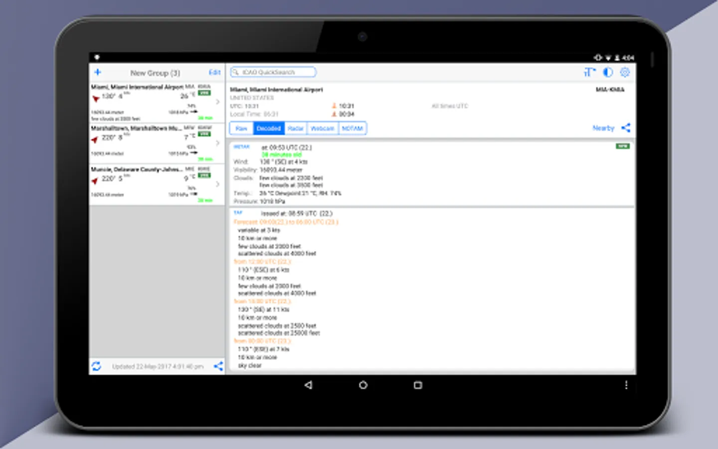 Get current and precise weather conditions (METAR) as well as weather forecasts (TAF), which are used by pilots for their flight preparations. You can choose worldwide airport weather stations from the built-in database by either name, ICAO or IATA code. Data will be shown in its original format or fully decoded into easy understandable texts.