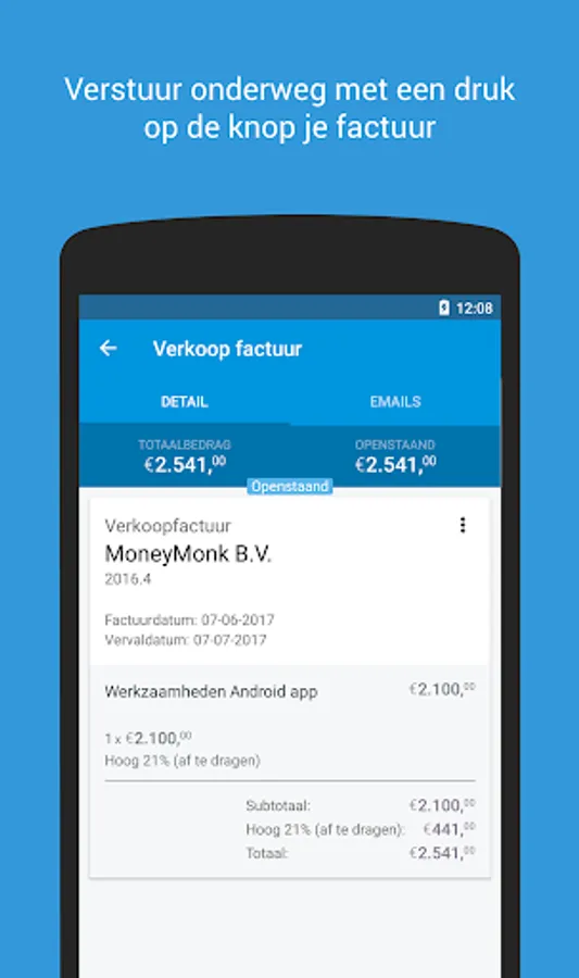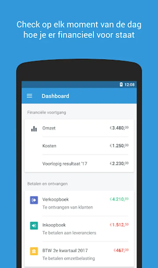 The Money Monk app you instant insight into your financial progress of your business ZZP, 'list' is key. At a glance you see the revenue, cost, and how much profit you've turned the last quarter. In addition, you can immediately see if you get tax return or pay just how far you are with the hour criterion, and how many invoices are still open. Sent directly from the app simply a reminder by email to your customer!