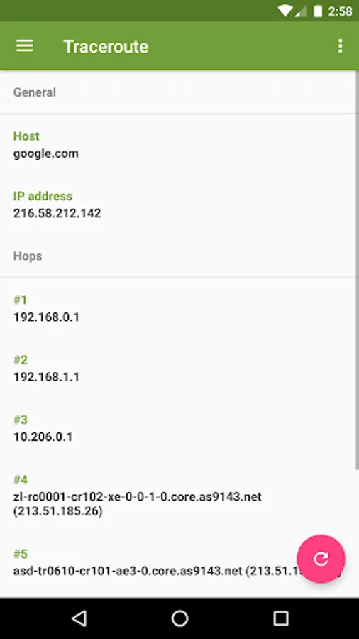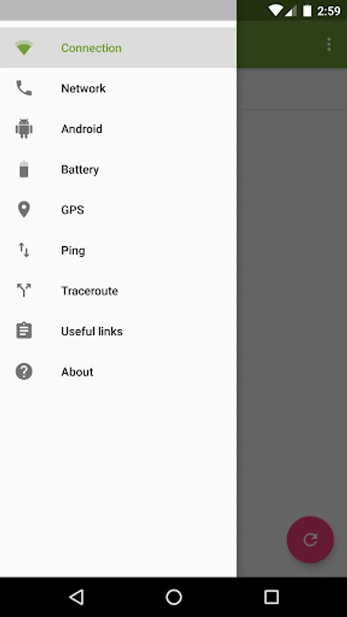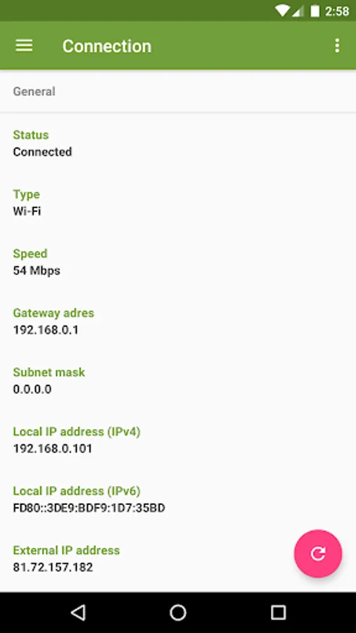 The app includes support for obtaining the following information: Remote IP address Remote Host Name, Local IP address (IPv4), Local IP address (IPv6), Mac address, gateway address, subnet mask, Wi-Fi status, Wi-Fi SSID, Wi-Fi BSSID, Wi-Fi signal, Wi-Fi frequency, Wi-Fi network ID, Hotspot status, associated hotspot devices, Bluetooth status, Android firmware, Android firmware version, Android firmware build number, Android firmware fingerprint, Android firmware identifier, Android firmware security patch, battery status, battery health, battery voltage, battery temperature, network status, network operator, SIM operator, location, status, location X coordinate, location Y coordinates, location accuracy, seal ping, connection traceroute and link hops.