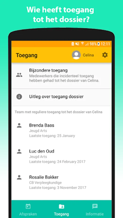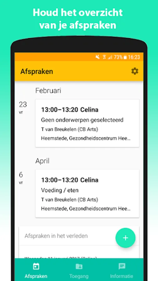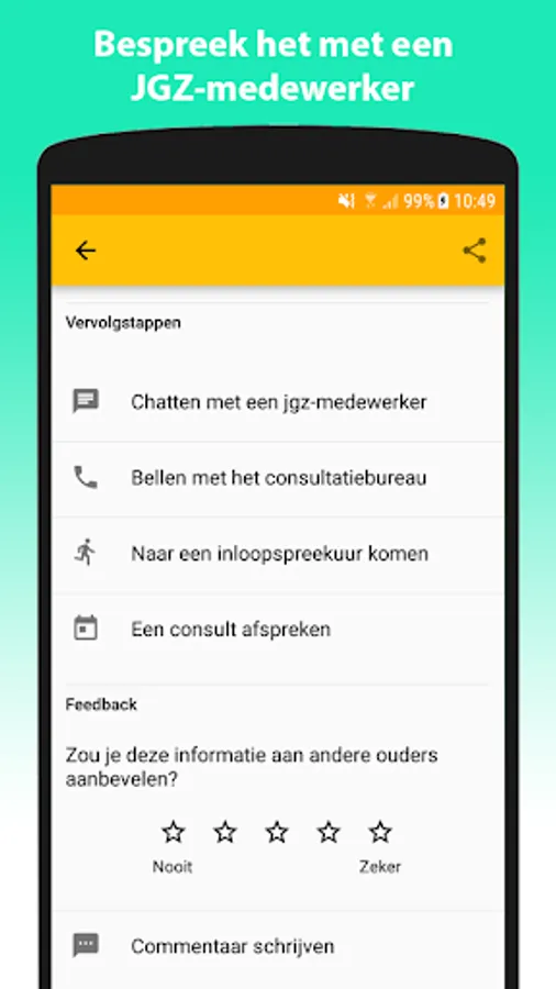 With the JgzApp it's your turn. You decide which JGZ employee you make an appointment with. When you add discussion topics to the appointment, the discussion points in the file are adjusted to the chosen topics. These will be discussed with the JGZ employee during the consultation. You can see which employee has viewed or edited the digital file at what time and for what purpose. You get an overview of your child's growth data and you can retrieve a growth chart directly from TNO within the app. There is also information available about upbringing, development, health and parenthood and you can contact the consultation office about this.