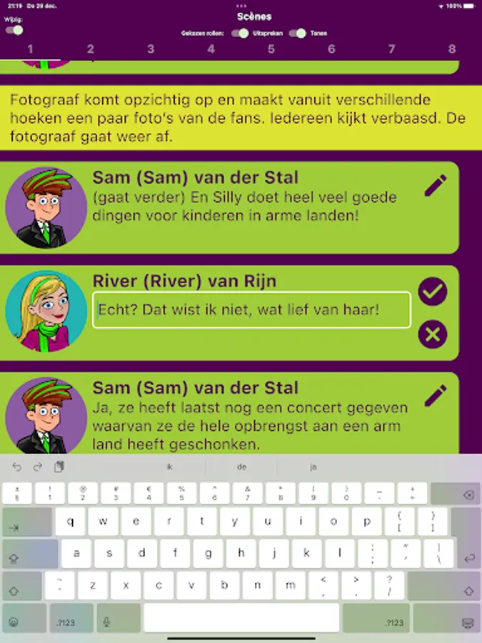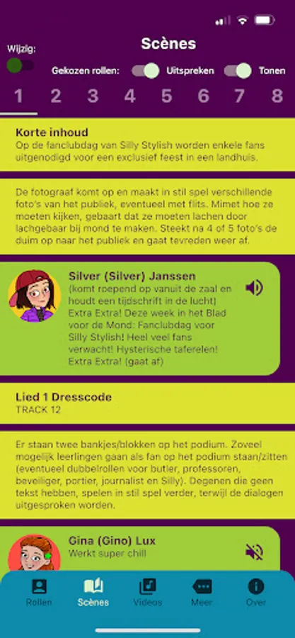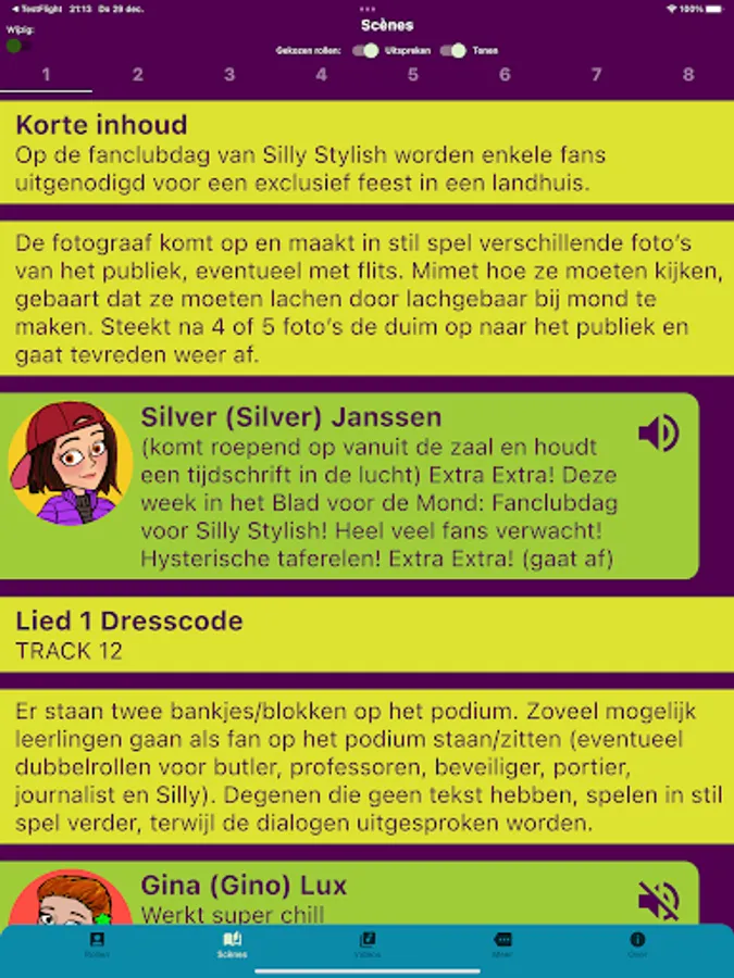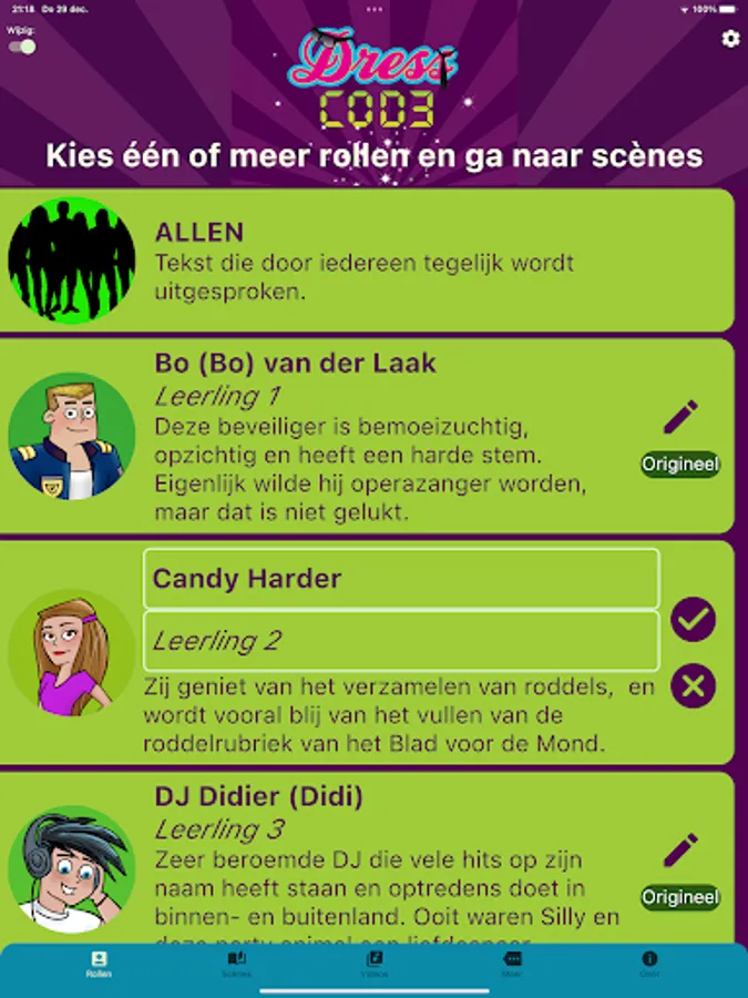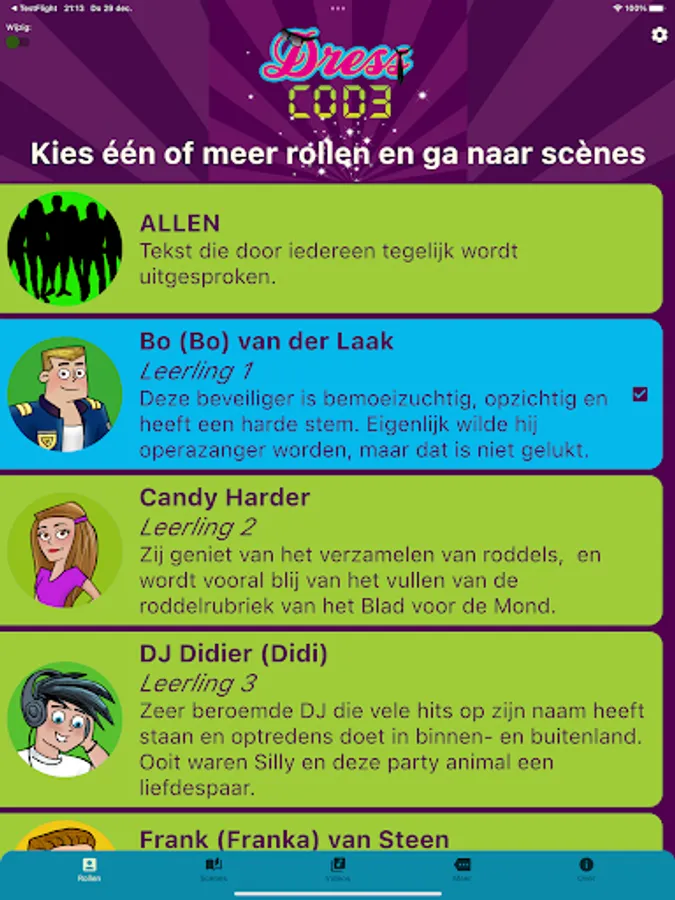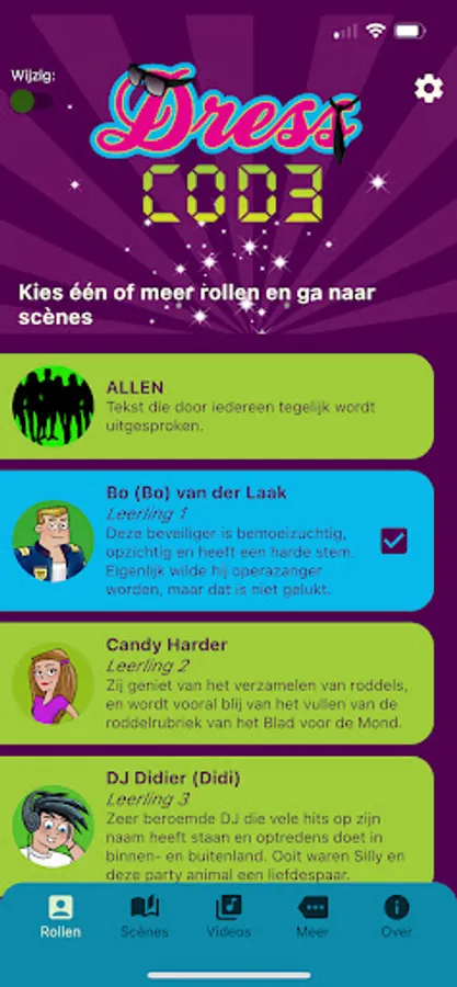 Enter your class code and password and practice all the scenes you play. In the deluxe version you also practice how to say a text with the spoken script and the teacher or administrator of the app can change all names and texts. How cool is that?!