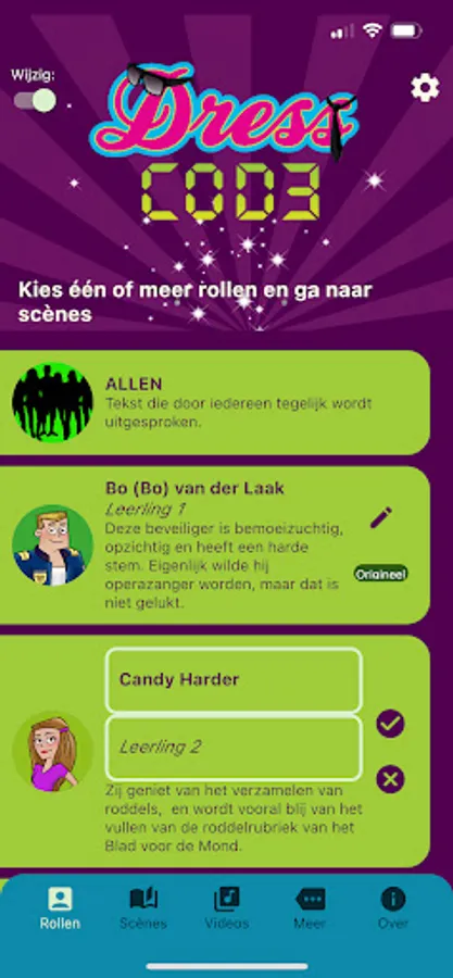 Enter your teacher code, after confirmation a slider 'Change' will appear at the top left. By moving the slider you immediately see pencils next to all names. Click on a pencil to add the player's name or change the role name. You see the same pencils next to the texts of all scenes. This allows you to edit all texts. By moving the 'Change' slider again, all changes can be saved. After that, all players can 'Update' the app from the cog in the top right corner of the 'Roles' tab and receive any changes that have been made.