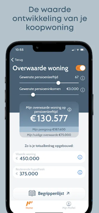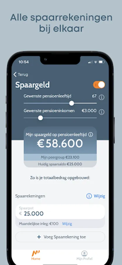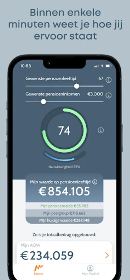 The app is super easy to complete. You immediately have an indication of how you are doing. Your pension, savings, investments, home value, everything together. Now and calculated to your desired retirement date. Always up to date.
