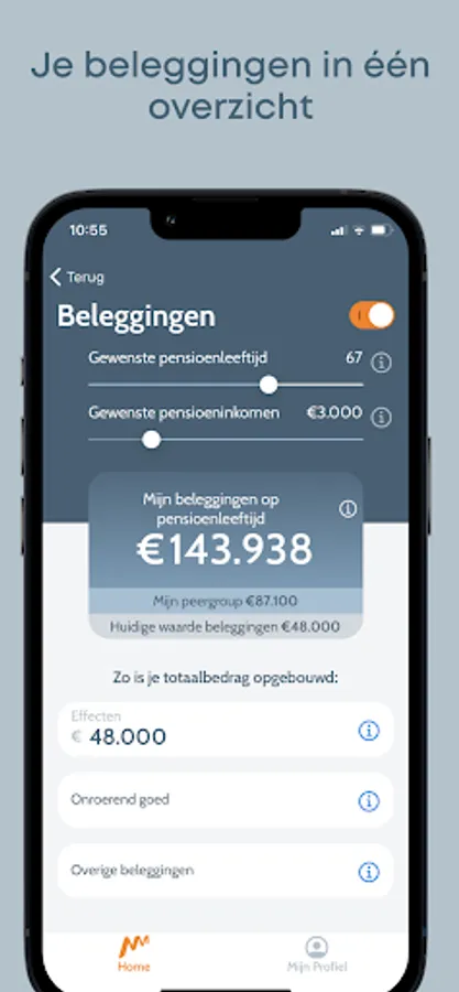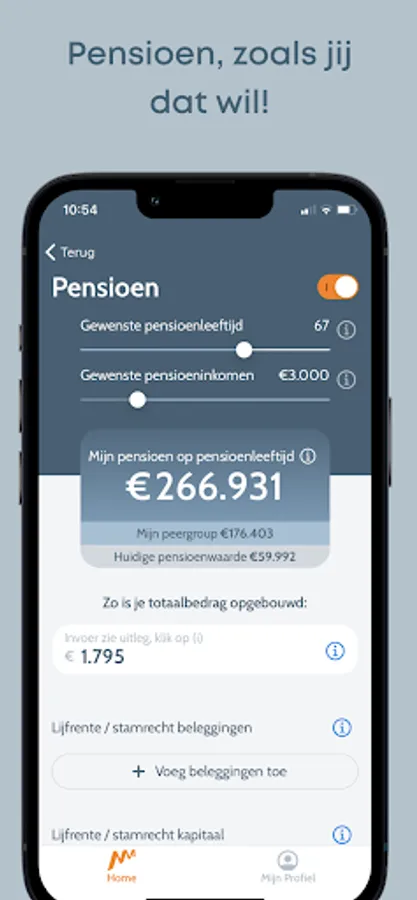 Do you want to stop working earlier or continue a little longer? Change your retirement age and the app will immediately show you what it means financially. The influence of higher or lower net income after retirement? Change your desired income and you immediately see what you are short of or how much money you already have left.