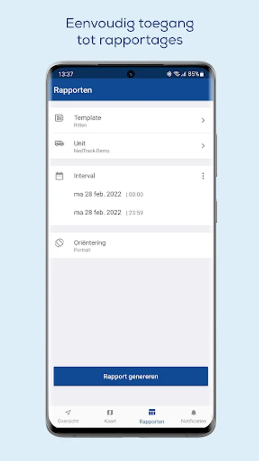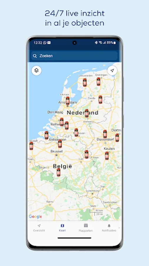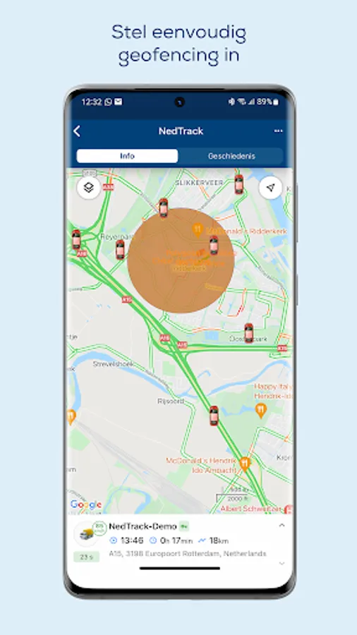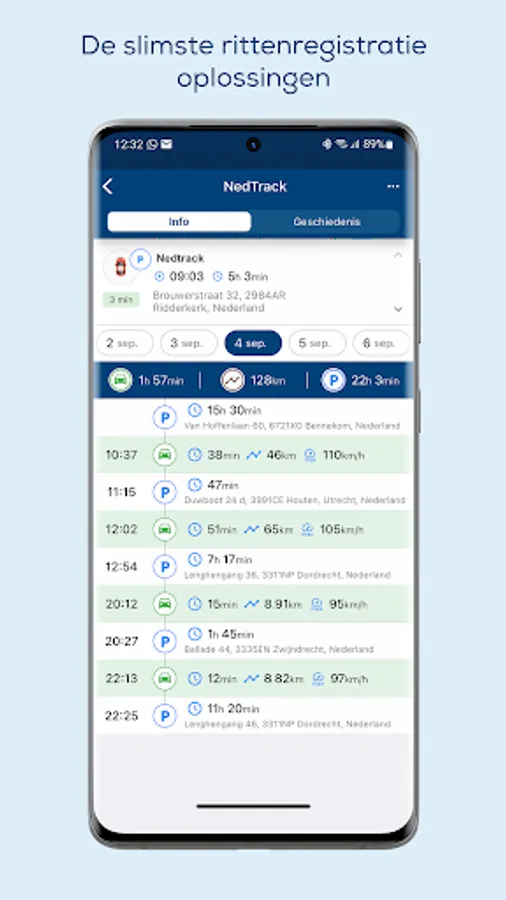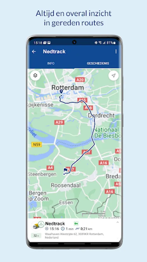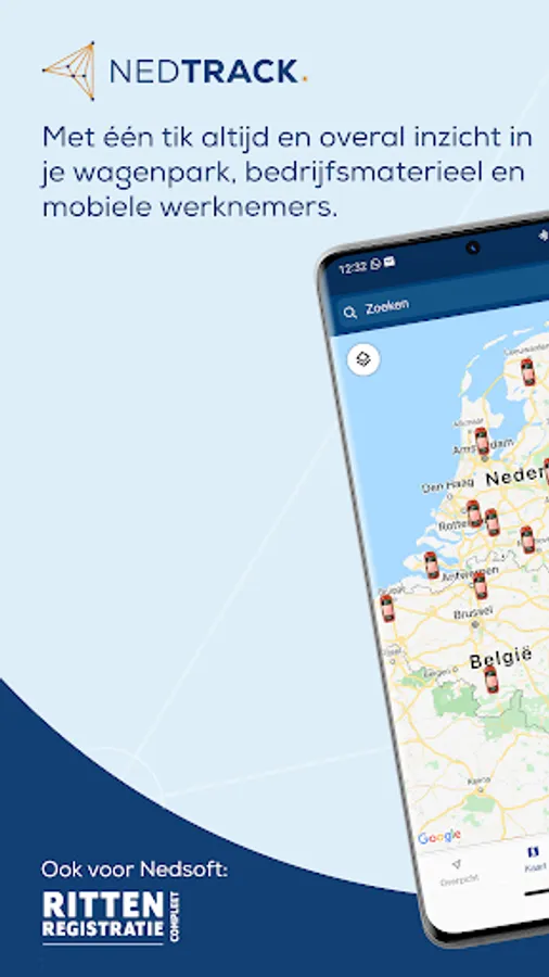 The possibilities of My Nedtrack are endless. With this extensive and handy app you have real-time insight into the location of your fleet, you can easily run reports for your journey registration or receive a notification when objects are moved.