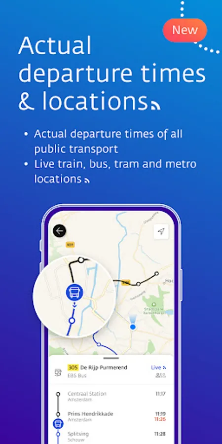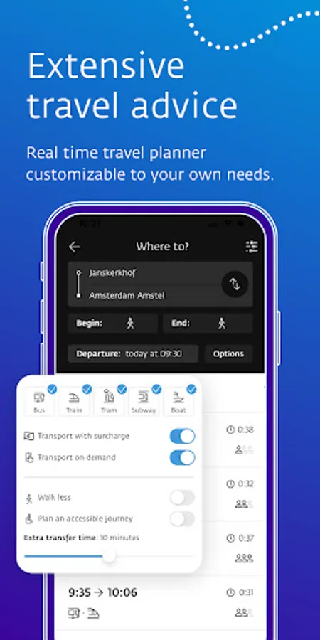 Thanks to the travel planner of 9292, you can plan all your trips in Netherlands with the train, bus, metro, tram, and ferry. Need to travel by bicycle, electric bicycle / scooter or a rental bike? We can include that in your travel advice. Enter your trip from A to B and we will immediately show you up-to-date travel information for all public transport in the Netherlands. And the app is also prepared for showing Flex-OV such as the watertaxi in Rotterdam. In case of any changes, we will show you an alternative travel advice. The up-to-date public transport planner provides live public transport info for NS, Arriva, Connexxion, Breng, Hermes, Keolis, RRReis, Qbuzz, EBS, U-OV, RET, HTM, GVB and Waterbus.