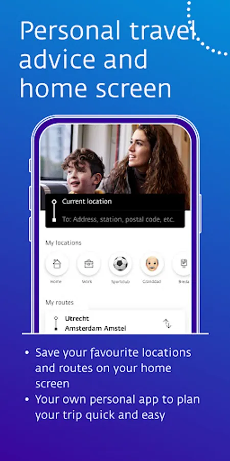 Enter your favourite locations and routes on the starting screen by using the plus-sign. This turns the 9292-app into your own personal app for quickly planning your trip from A to B, without needing an account. You can also add a bus stop or station you frequently use to your starting screen this way. Now you will always have access to the up-to-date departure times of that stop.