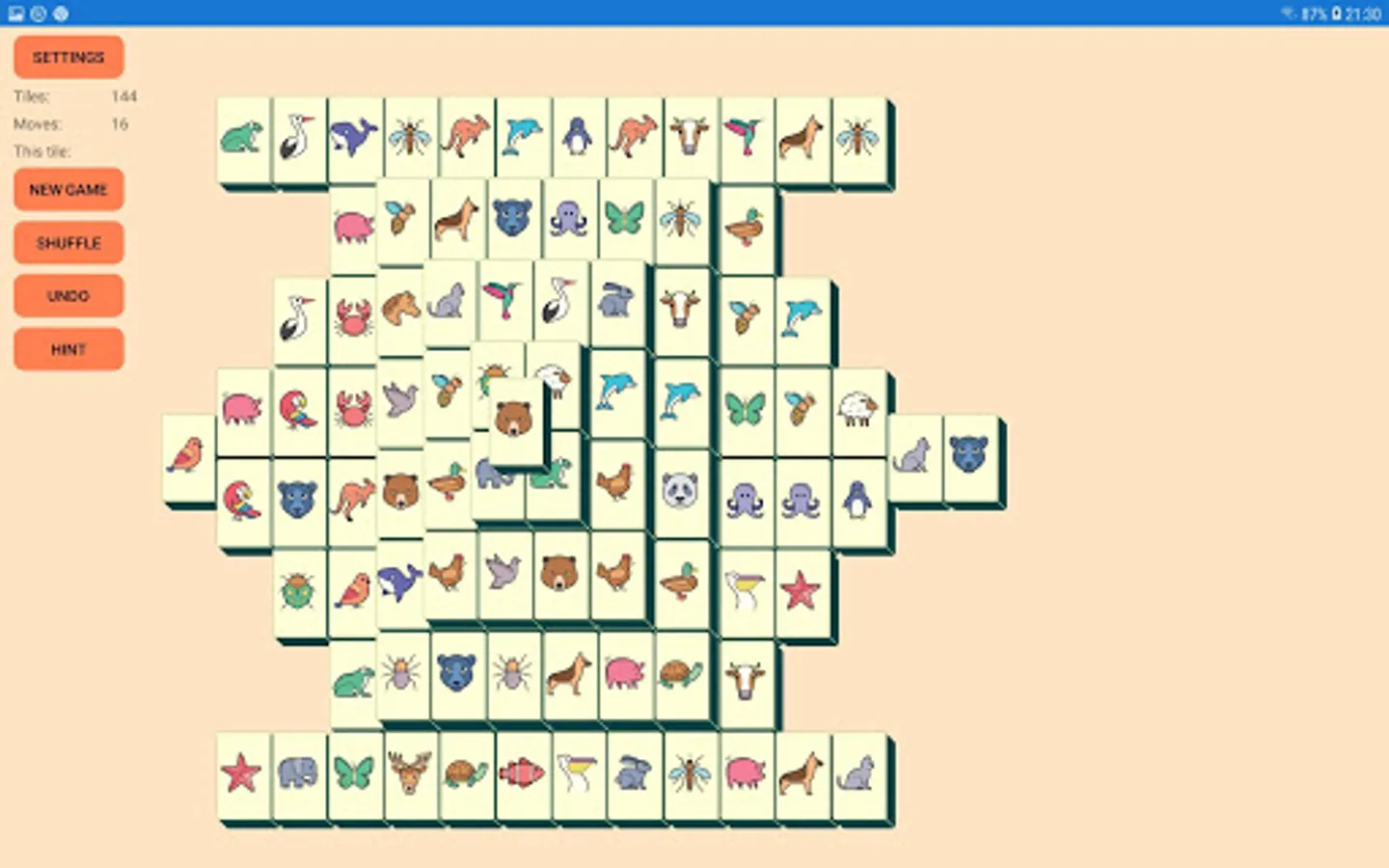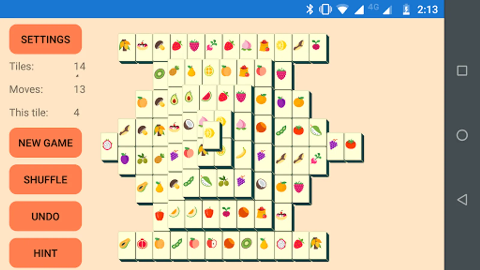 The classic Mahjongg game is translated to a cheerful game with fruit and animal tiles. The game contains two types of boards to play.